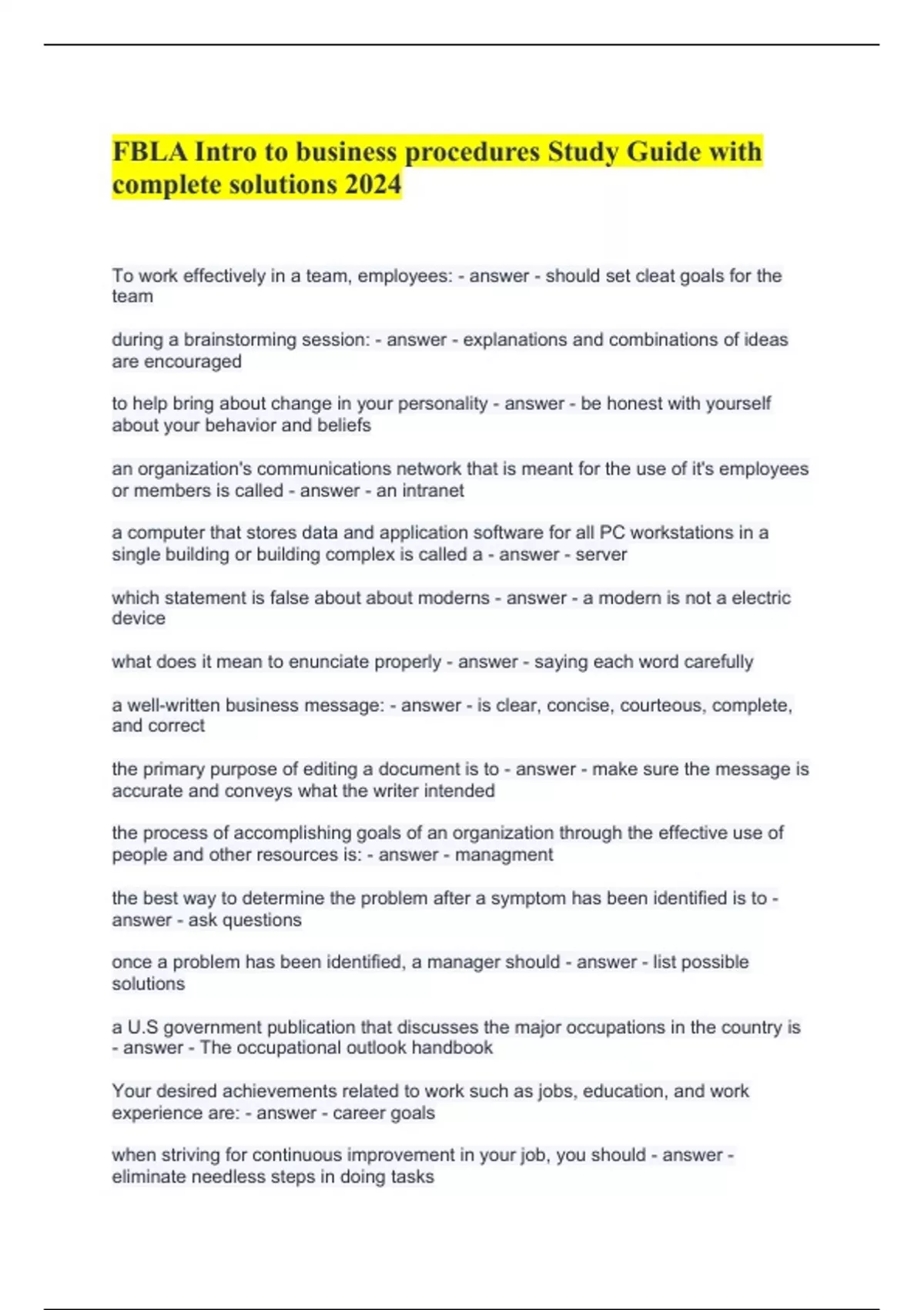 FBLA Intro to business procedures Study Guide with complete solutions 2024