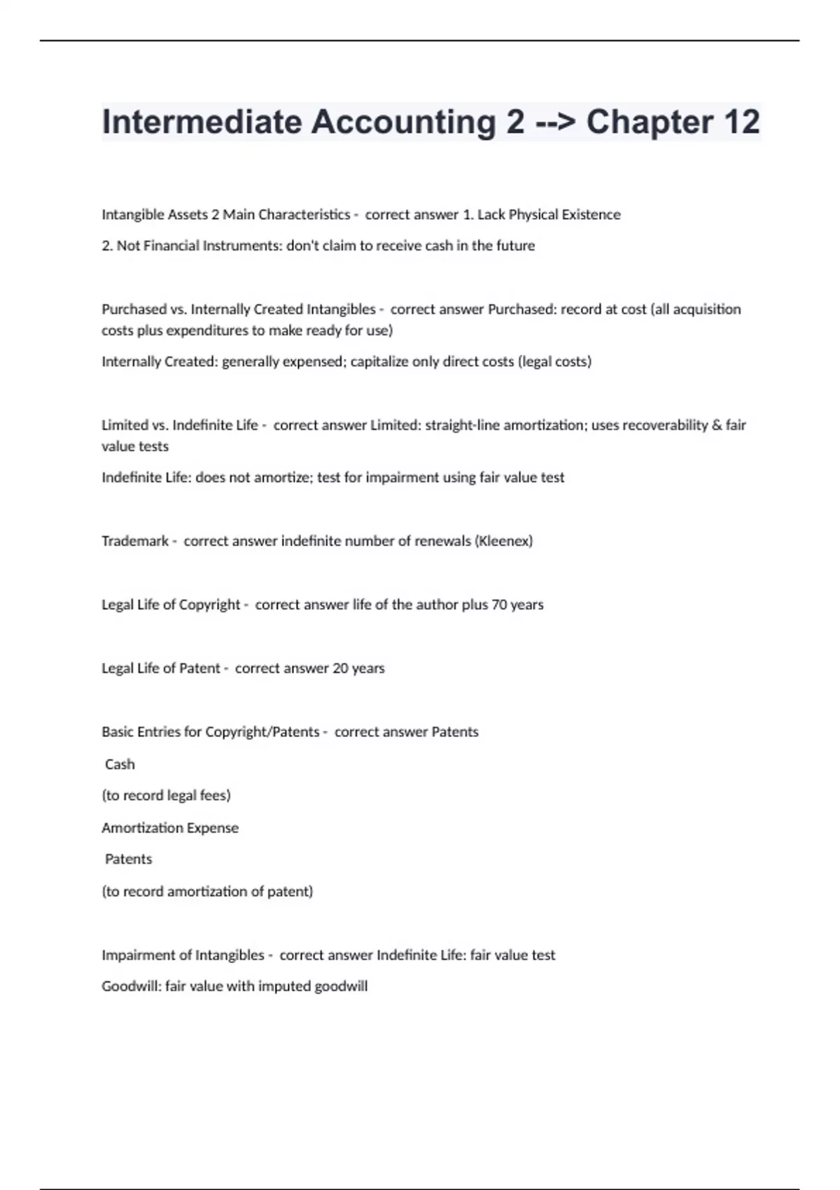Intermediate Accounting 2 -- Chapter 12 Intangible Assets 2 Main Characteristics - correct answer 1. Lack Physical Existence 2. Not Financial Instruments: don't claim to receive cash in the future Purchased vs. Internally Created Intangibles - correct answer Purchased: record at cost (all acquisition costs plus expenditures to make ready for use) Internally Created: generally expensed; capitalize only direct costs (legal costs) Limited vs. Indefinite Life - correct answer Limited: straight-line amortization; uses recoverability & fair value tests Indefinite Life: does not amortize; test for impairment using fair value test Trademark - correct answer indefinite number of renewals (Kleenex) Legal Life of Copyright - correct answer life of the author plus 70 years Legal Life of Patent - correct answer 20 years Basic Entries for Copyright/Patents - correct answer Patents Cash (to record legal fees) Amortization Expense Patents (to record amortization of patent) Impairment of Intangibles - correct answer Indefinite Life: fair value test Goodwill: fair value with imputed goodwill