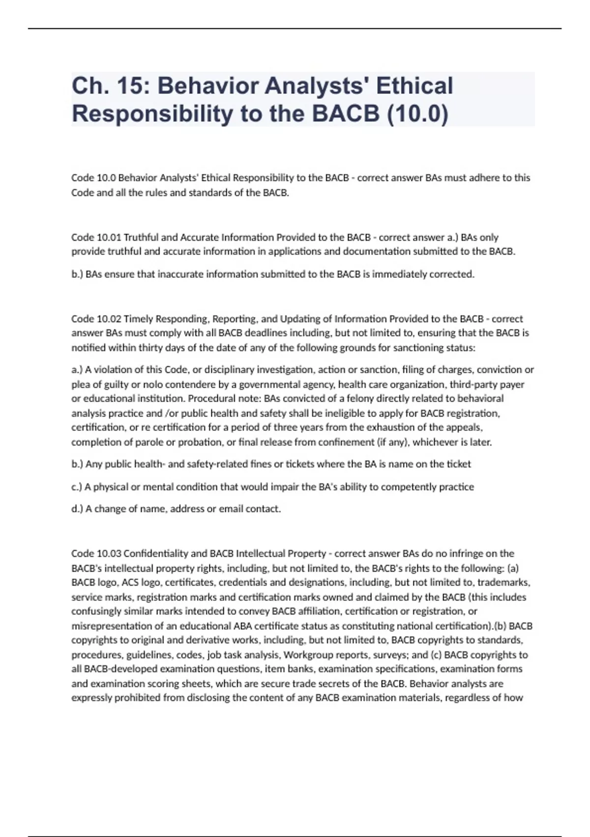 Ch. 15 Behavior Analysts' Ethical Responsibility to the BACB (10.0) Code 10.0 Behavior Analysts' Ethical Responsibility to the BACB - correct answer BAs must adhere to this Code and all the rules and standards of the BACB. Code 10.01 Truthful and Accurate Information Provided to the BACB - correct answer a.) BAs only provide truthful and accurate information in applications and documentation submitted to the BACB. b.) BAs ensure that inaccurate information submitted to the BACB is immediately corrected. Code 10.02 Timely Responding, Reporting, and Updating of Information Provided to the BACB - correct answer BAs must comply with all BACB deadlines including, but not limited to, ensuring that the BACB is notified within thirty days of the date of any of the following grounds for sanctioning status: a.) A violation of this Code, or disciplinary investigation, action or sanction, filing of charges, conviction or plea of guilty or nolo contendere by a governmental agency, health care organization, third-party payer or educational institution. Procedural note: BAs convicted of a felony directly related to behavioral analysis practice and /or public health and safety shall be ineligible to apply for BACB registration, certification, or re certification for a period of three years from the exhaustion of the appeals, completion of parole or probation, or final release from confinement (if any), whichever is later. b.) Any public health- and safety-related fines or tickets where the BA is name on the ticket c.) A physical or mental condition that would impair the BA's ability to competently practice d.) A change of name, address or email contact.