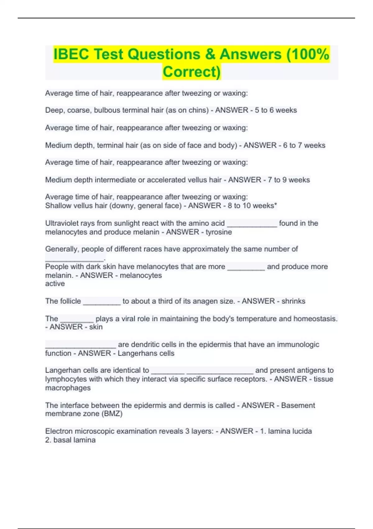 IBEC Test Questions & Answers (100% Correct) IBEC Test Questions & Answers (100% Correct) Average time of hair, reappearance after tweezing or waxing: Deep, coarse, bulbous terminal hair (as on chins) - ANSWER - 5 to 6 weeks Average time of hair, reappearance after tweezing or waxing: Medium depth, terminal hair (as on side of face and body) - ANSWER - 6 to 7 weeks Average time of hair, reappearance after tweezing or waxing: Medium depth intermediate or accelerated vellus hair - ANSWER - 7 to 9 weeks Average time of hair, reappearance after tweezing or waxing: Shallow vellus hair (downy, general face) - ANSWER - 8 to 10 weeks* Ultraviolet rays from sunlight react with the amino acid ____________ found in the melanocytes and produce melanin - ANSWER - tyrosine Generally, people of different races have approximately the same number of ______________. People with dark skin have melanocytes that are more _________ and produce more melanin. - ANSWER - melanocytes active The follicle _________ to about a third of its anagen size. - ANSWER - shrinks The ________ plays a viral role in maintaining the body's temperature and homeostasis. - ANSWER - skin _________________ are dendritic cells in the epidermis that have an immunologic function - ANSWER - Langerhans cells Langerhan cells are identical to ________ ________________ and present antigens to lymphocytes with which they interact via specific surface receptors. - ANSWER - tissue macrophages The interface between the epidermis and dermis is called - ANSWER - Basement membrane zone (BMZ) Electron microscopic examination reveals 3 layers: - ANSWER - 1. lamina lucida 2. basal lamina 3. anchoring fibrils Lamina lucida - ANSWER - relatively lucid zone transversed by delicate anchoring filaments that connect the cell membrane of the basal cell with the basal lamina