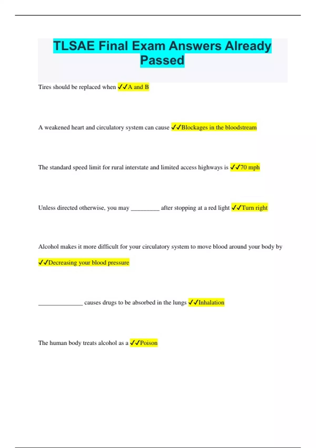 TLSAE Final Exam Answers Already Passed Tires should be replaced when A and B A weakened heart and circulatory system can cause Blockages in the bloodstream The standard speed limit for rural interstate and limited access highways is 70 mph Unless directed otherwise, you may _________ after stopping at a red light Turn right Alcohol makes it more difficult for your circulatory system to move blood around your body by Decreasing your blood pressure ______________ causes drugs to be absorbed in the lungs Inhalation The human body treats alcohol as a Poison Alcoholic cardiomyopathy is especially dangerous because Sufferers sometimes show no symptoms until a fatal heart attack Which of the following is a reason that a person can receive a diagnosis of drug dependence? Failing to quit a drug despite a desire to do so In 2009, Florida suffered more _________ fatalities than any other state Bicyclist Crashes caused by speeding vehicles killed __________ people in 2009. 10,591 _________ commonly cause increased energy and alertness, increased heart rate and respiration, and loss of appetite Stuimulants In 2007, __________ Floridians died in alcohol-related collisions 1,051 Your license can never be revoked for a temporary medical condition (True or False) False Which of the following drugs has an increased risk of overdose when taken with alcohol? All choices are correct The ___________ coordinates numerous bodily functions by sending signals from one cell to another or from one region to another Nervous system Most ________ signs are diamond-shaped with