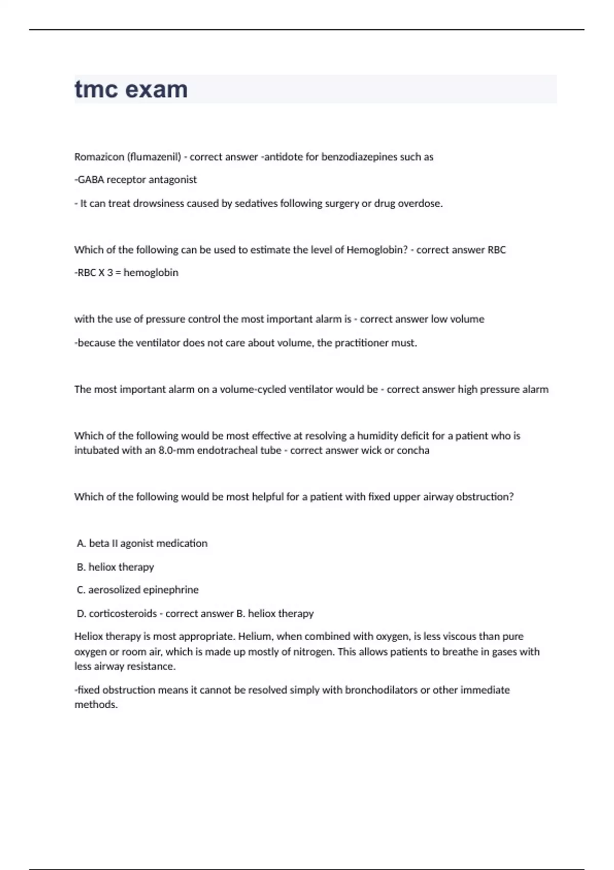 TMC Review Practice Exam Questions 2024. Romazicon (flumazenil) - correct answer -antidote for benzodiazepines such as -GABA receptor antagonist - It can treat drowsiness caused by sedatives following surgery or drug overdose. Which of the following can be used to estimate the level of Hemoglobin? - correct answer RBC -RBC X 3 = hemoglobin with the use of pressure control the most important alarm is - correct answer low volume -because the ventilator does not care about volume, the practitioner must. The most important alarm on a volume-cycled ventilator would be - correct answer high pressure alarm Which of the following would be most effective at resolving a humidity deficit for a patient who is intubated with an 8.0-mm endotracheal tube - correct answer wick or concha Which of the following would be most helpful for a patient with fixed upper airway obstruction? A. beta II agonist medication B. heliox therapy C. aerosolized epinephrine D. corticosteroids - correct answer B. heliox therapy Heliox therapy is most appropriate. Helium, when combined with oxygen, is less viscous than pure oxygen or room air, which is made up mostly of nitrogen. This allows patients to breathe in gases with less airway resistance. -fixed obstruction means it cannot be resolved simply with bronchodilators or other immediate