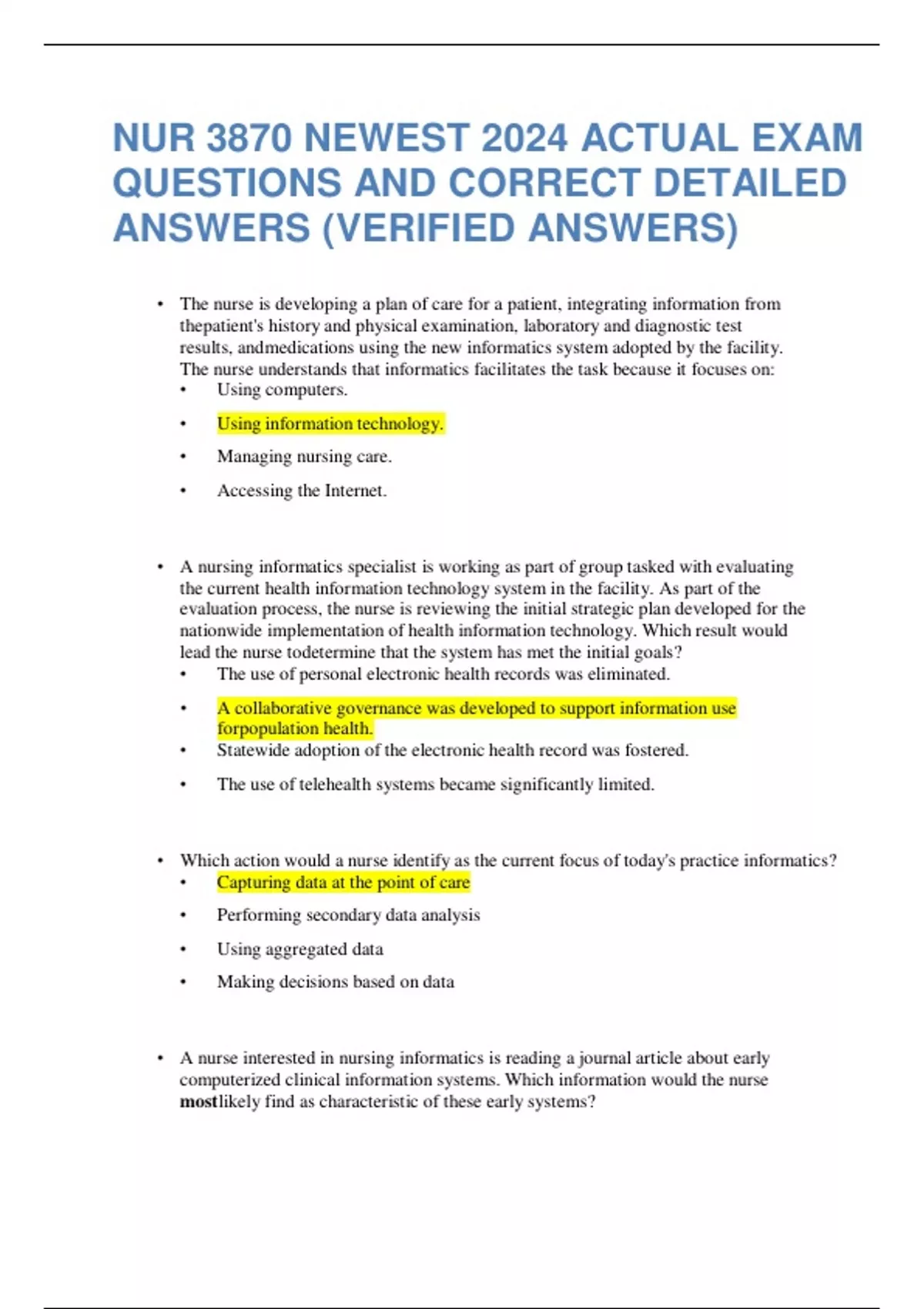 NUR 3870 NEWEST 2024 ACTUAL EXAM QUESTIONS AND CORRECT DETAILED ANSWERS (VERIFIED ANSWERS)