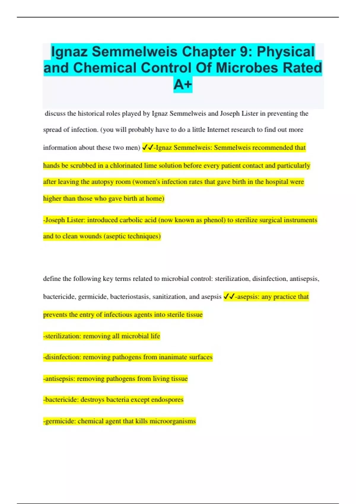 Ignaz Semmelweis Chapter 9: Physical and Chemical Control Of Microbes Rated A+ discuss the historical roles played by Ignaz Semmelweis and Joseph Lister in preventing the spread of infection. (you will probably have to do a little Internet research to find out more information about these two men) -Ignaz Semmelweis: Semmelweis recommended that hands be scrubbed in a chlorinated lime solution before every patient contact and particularly after leaving the autopsy room (women's infection rates that gave birth in the hospital were higher than those who gave birth at home) -Joseph Lister: introduced carbolic acid (now known as phenol) to sterilize surgical instruments and to clean wounds (aseptic techniques) define the following key terms related to microbial control: sterilization, disinfection, antisepsis, bactericide, germicide, bacteriostasis, sanitization, and asepsis -asepsis: any practice that prevents the entry of infectious agents into sterile tissue -sterilization: removing all microbial life -disinfection: removing pathogens from inanimate surfaces -antisepsis: removing pathogens from living tissue -bactericide: destroys bacteria except endospores -germicide: chemical agent that kills microorganisms -bacteriostasis: microbes are temporarily prevented from multiplying -sanitization: cleansing technique that mechanically removes microorganisms indicate the 4 main factors that determine how effective an antimicrobial control method is depends on: 1. number of microbes 2. environment (organic matter, temp, biofilms) 3. time of exposure 4. microbial characteristics (some microbes have certain structural features that enable them to survive certain treatments like thermodurics) illustrate the hierarchy of microorganisms from those easiest to destroy to those most difficult to destroy (see figures in powerpoint) easiest to hardest: 1. enveloped viruses 2. gram positive 3. non enveloped viruses 4. fungi/ fungal spores 5. most gram- negative bacteria 6. protozoan trophozoites 7. protozoan cysts 8. mycobacterium 9. bacterial endospores 10. prions compare and contrast "cidal" and "static" microbial control processes -"cide": kill or destroy -"static": stop or stand still describe the effects of microbial control