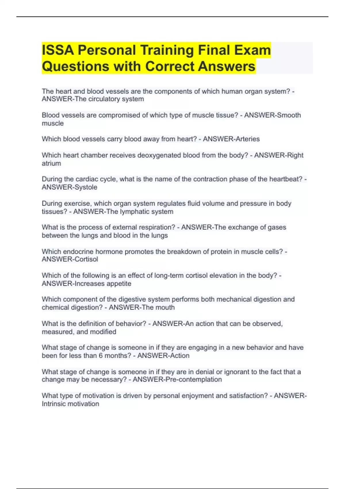 The heart and blood vessels are the components of which human organ system? - ANSWER-The circulatory system Blood vessels are compromised of which type of muscle tissue? - ANSWER-Smooth muscle Which blood vessels carry blood away from heart? - ANSWER-Arteries Which heart chamber receives deoxygenated blood from the body? - ANSWER-Right atrium During the cardiac cycle, what is the name of the contraction phase of the heartbeat? - ANSWER-Systole During exercise, which organ system regulates fluid volume and pressure in body tissues? - ANSWER-The lymphatic system What is the process of external respiration? - ANSWER-The exchange of gases between the lungs and blood in the lungs Which endocrine hormone promotes the breakdown of protein in muscle cells? - ANSWER-Cortisol Which of the following is an effect of long-term cortisol elevation in the body? - ANSWER-Increases appetite Which component of the digestive system performs both mechanical digestion and chemical digestion? - ANSWER-The mouth What is the definition of behavior? - ANSWER-An action that can be observed, measured, and modified What stage of change is someone in if they are engaging in a new behavior and have been for less than 6 months? - ANSWER-Action What stage of change is someone in if they are in denial or ignorant to the fact that a change may be necessary? - ANSWER-Pre-contemplation What type of motivation is driven by personal enjoyment and satisfaction? - ANSWER-Intrinsic motivation