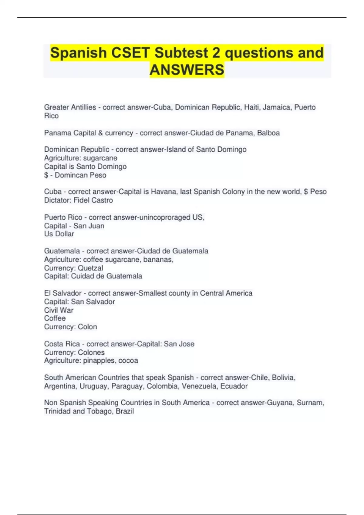 Greater Antillies - correct answer-Cuba, Dominican Republic, Haiti, Jamaica, Puerto Rico Panama Capital & currency - correct answer-Ciudad de Panama, Balboa Dominican Republic - correct answer-Island of Santo Domingo Agriculture: sugarcane Capital is Santo Domingo $ - Domincan Peso Cuba - correct answer-Capital is Havana, last Spanish Colony in the new world, $ Peso Dictator: Fidel Castro Puerto Rico - correct answer-unincoproraged US, Capital - San Juan Us Dollar Guatemala - correct answer-Ciudad de Guatemala Agriculture: coffee sugarcane, bananas, Currency: Quetzal Capital: Cuidad de Guatemala El Salvador - correct answer-Smallest county in Central America Capital: San Salvador Civil War Coffee Currency: Colon Costa Rica - correct answer-Capital: San Jose Currency: Colones Agriculture: pinapples, cocoa South American Countries that speak Spanish - correct answer-Chile, Bolivia, Argentina, Uruguay, Paraguay, Colombia, Venezuela, Ecuador Non Spanish Speaking Countries in South America - correct answer-Guyana, Surnam, Trinidad and Tobago, Brazil