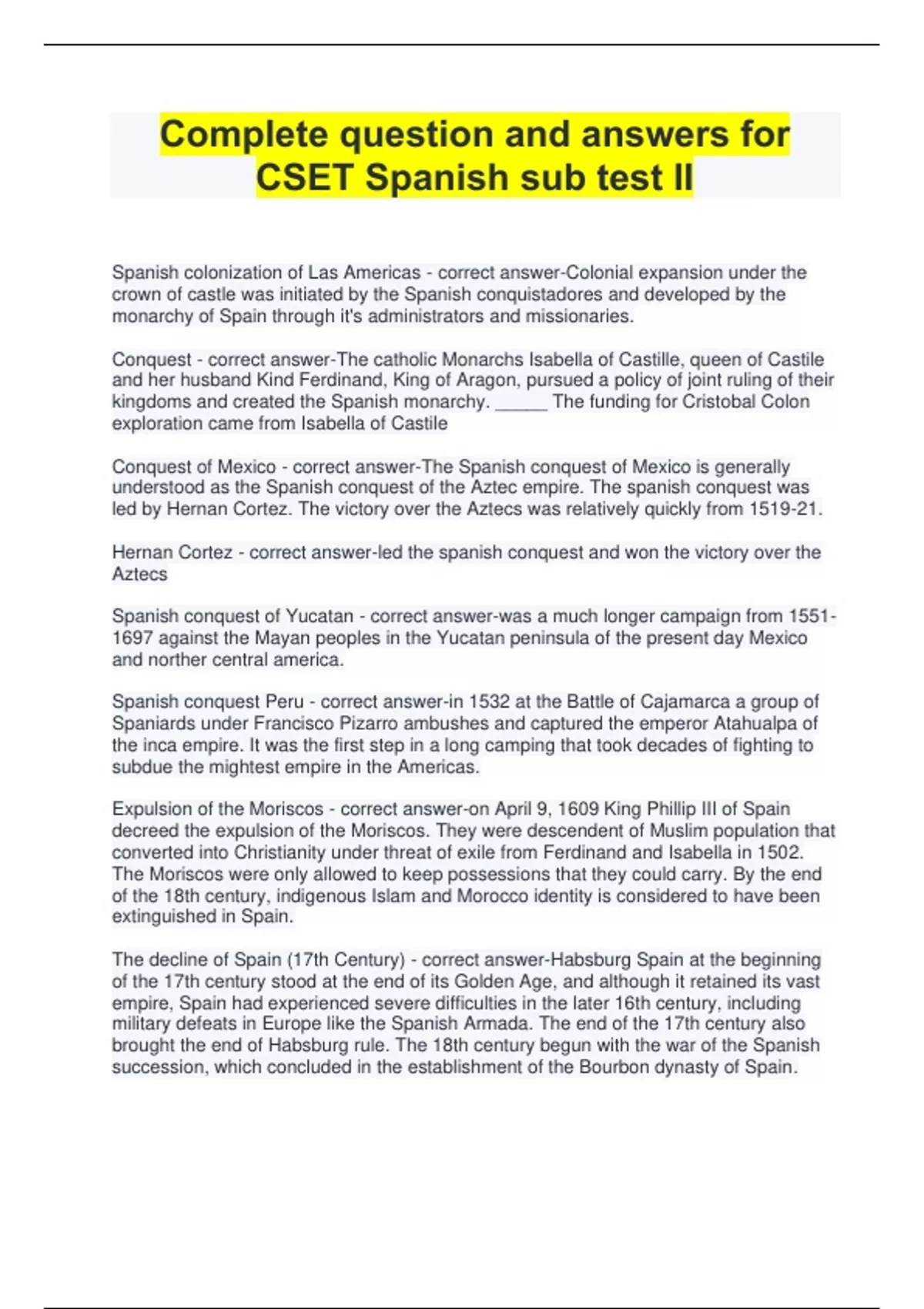 Spanish colonization of Las Americas - correct answer-Colonial expansion under the crown of castle was initiated by the Spanish conquistadores and developed by the monarchy of Spain through it's administrators and missionaries. Conquest - correct answer-The catholic Monarchs Isabella of Castille, queen of Castile and her husband Kind Ferdinand, King of Aragon, pursued a policy of joint ruling of their kingdoms and created the Spanish monarchy. _____ The funding for Cristobal Colon exploration came from Isabella of Castile Conquest of Mexico - correct answer-The Spanish conquest of Mexico is generally understood as the Spanish conquest of the Aztec empire. The spanish conquest was led by Hernan Cortez. The victory over the Aztecs was relatively quickly from 1519-21. Hernan Cortez - correct answer-led the spanish conquest and won the victory over the Aztecs Spanish conquest of Yucatan - correct answer-was a much longer campaign from against the Mayan peoples in the Yucatan peninsula of the present day Mexico and norther central america. Spanish conquest Peru - correct answer-in 1532 at the Battle of Cajamarca a group of Spaniards under Francisco Pizarro ambushes and captured the emperor Atahualpa of the inca empire. It was the first step in a long camping that took decades of fighting to subdue the mightest empire in the Americas. Expulsion of the Moriscos - correct answer-on April 9, 1609 King Phillip III of Spain decreed the expulsion of the Moriscos. They were descendent of Muslim population that converted into Christianity under threat of exile from Ferdinand and Isabella in 1502. The Moriscos were only allowed to keep possessions that they could carry. By the end of the 18th century, indigenous Islam and Morocco identity is considered to have been extinguished in Spain. The decline of Spain (17th Century) - correct answer-Habsburg Spain at the beginning of the 17th century stood at the end of its Golden Age, and although it retained its vast empire, Spain had experienced severe difficulties in the later 16th century, including military defeats in Europe like the Spanish Armada. The end of the 17th century also brought the end of Habsburg rule. The 18th century begun with the war of the Spanish succession, which concluded in the establishment of the Bourbon dynasty of Spain.
