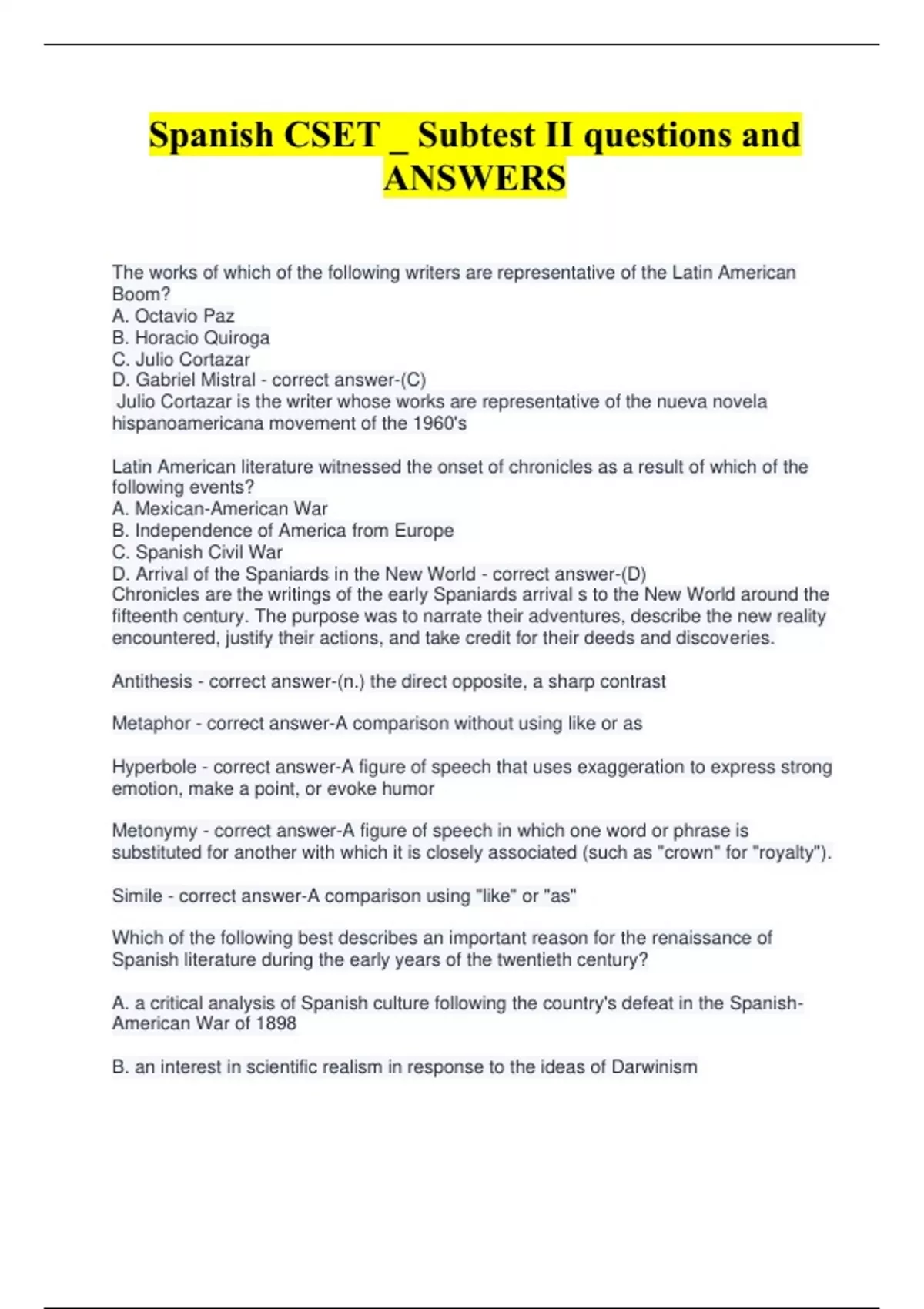 The works of which of the following writers are representative of the Latin American Boom? A. Octavio Paz B. Horacio Quiroga C. Julio Cortazar D. Gabriel Mistral - correct answer-(C) Julio Cortazar is the writer whose works are representative of the nueva novela hispanoamericana movement of the 1960's Latin American literature witnessed the onset of chronicles as a result of which of the following events? A. Mexican-American War B. Independence of America from Europe C. Spanish Civil War D. Arrival of the Spaniards in the New World - correct answer-(D) Chronicles are the writings of the early Spaniards arrival s to the New World around the fifteenth century. The purpose was to narrate their adventures, describe the new reality encountered, justify their actions, and take credit for their deeds and discoveries. Antithesis - correct answer-(n.) the direct opposite, a sharp contrast Metaphor - correct answer-A comparison without using like or as Hyperbole - correct answer-A figure of speech that uses exaggeration to express strong emotion, make a point, or evoke humor Metonymy - correct answer-A figure of speech in which one word or phrase is substituted for another with which it is closely associated (such as "crown" for "royalty"). Simile - correct answer-A comparison using "like" or "as" Which of the following best describes an important reason for the renaissance of Spanish literature during the early years of the twentieth century? A. a critical analysis of Spanish culture following the country's defeat in the Spanish-American War of 1898 B. an interest in scientific realism in response to the ideas of Darwinism