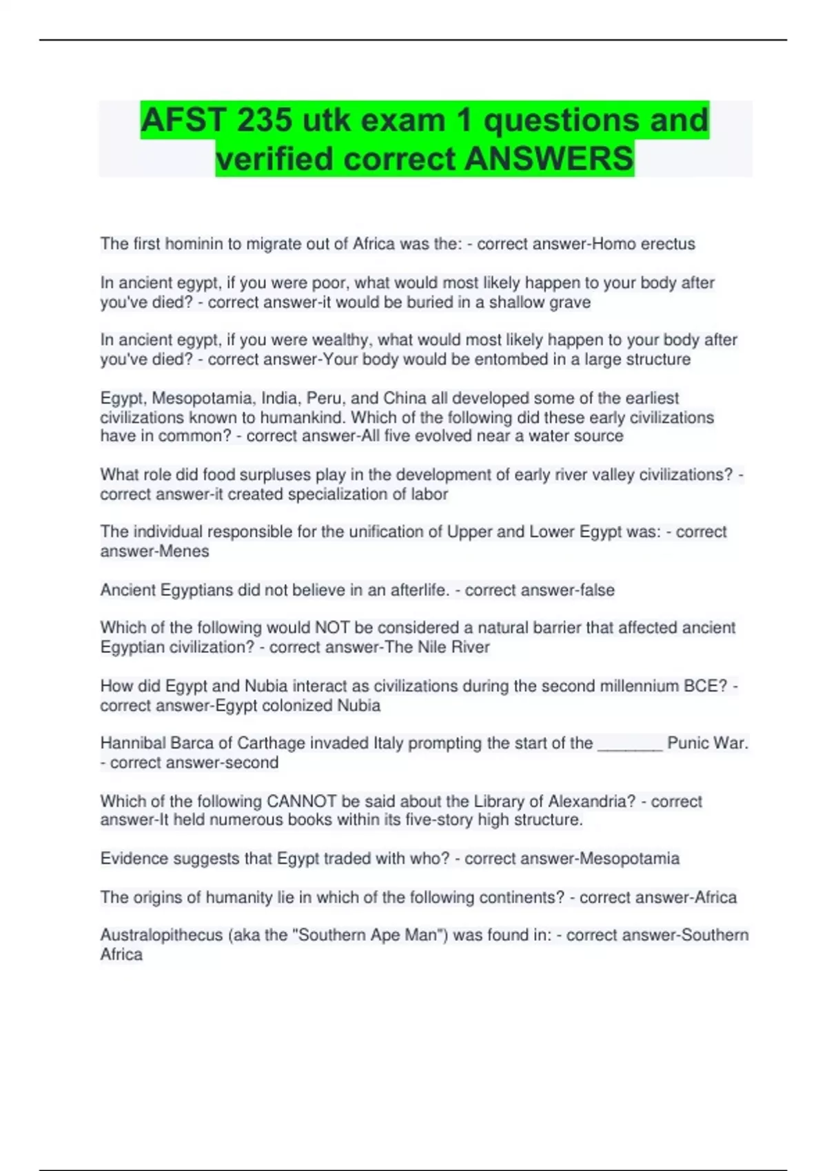 The first hominin to migrate out of Africa was the: - correct answer-Homo erectus In ancient egypt, if you were poor, what would most likely happen to your body after you've died? - correct answer-it would be buried in a shallow grave In ancient egypt, if you were wealthy, what would most likely happen to your body after you've died? - correct answer-Your body would be entombed in a large structure Egypt, Mesopotamia, India, Peru, and China all developed some of the earliest civilizations known to humankind. Which of the following did these early civilizations have in common? - correct answer-All five evolved near a water source What role did food surpluses play in the development of early river valley civilizations? - correct answer-it created specialization of labor The individual responsible for the unification of Upper and Lower Egypt was: - correct answer-Menes Ancient Egyptians did not believe in an afterlife. - correct answer-false Which of the following would NOT be considered a natural barrier that affected ancient Egyptian civilization? - correct answer-The Nile River How did Egypt and Nubia interact as civilizations during the second millennium BCE? - correct answer-Egypt colonized Nubia Hannibal Barca of Carthage invaded Italy prompting the start of the _______ Punic War. - correct answer-second Which of the following CANNOT be said about the Library of Alexandria? - correct answer-It held numerous books within its five-story high structure. Evidence suggests that Egypt traded with who? - correct answer-Mesopotamia The origins of humanity lie in which of the following continents? - correct answer-Africa Australopithecus (aka the "Southern Ape Man") was found in: - correct answer-Southern Africa