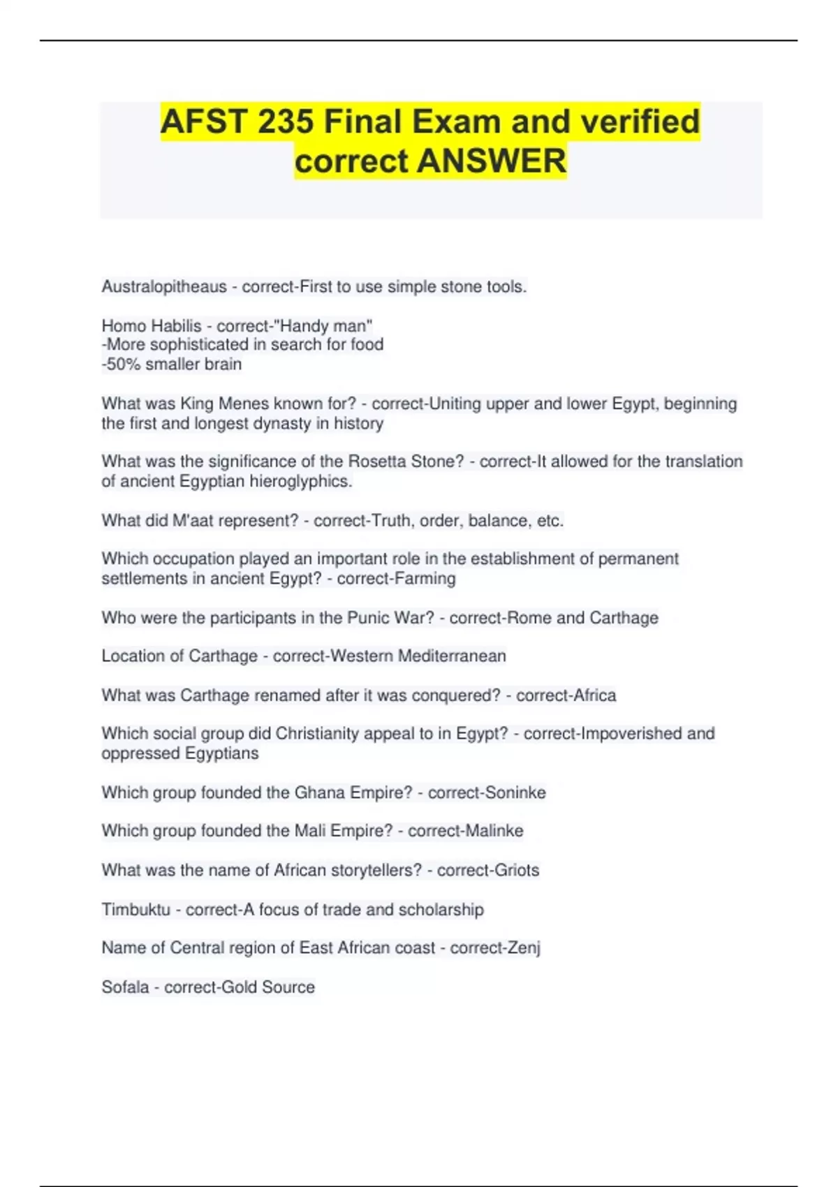 Australopitheaus - correct-First to use simple stone tools. Homo Habilis - correct-"Handy man" -More sophisticated in search for food -50% smaller brain What was King Menes known for? - correct-Uniting upper and lower Egypt, beginning the first and longest dynasty in history What was the significance of the Rosetta Stone? - correct-It allowed for the translation of ancient Egyptian hieroglyphics. What did M'aat represent? - correct-Truth, order, balance, etc. Which occupation played an important role in the establishment of permanent settlements in ancient Egypt? - correct-Farming Who were the participants in the Punic War? - correct-Rome and Carthage Location of Carthage - correct-Western Mediterranean What was Carthage renamed after it was conquered? - correct-Africa Which social group did Christianity appeal to in Egypt? - correct-Impoverished and oppressed Egyptians Which group founded the Ghana Empire? - correct-Soninke Which group founded the Mali Empire? - correct-Malinke What was the name of African storytellers? - correct-Griots Timbuktu - correct-A focus of trade and scholarship Name of Central region of East African coast - correct-Zenj Sofala - correct-Gold Source