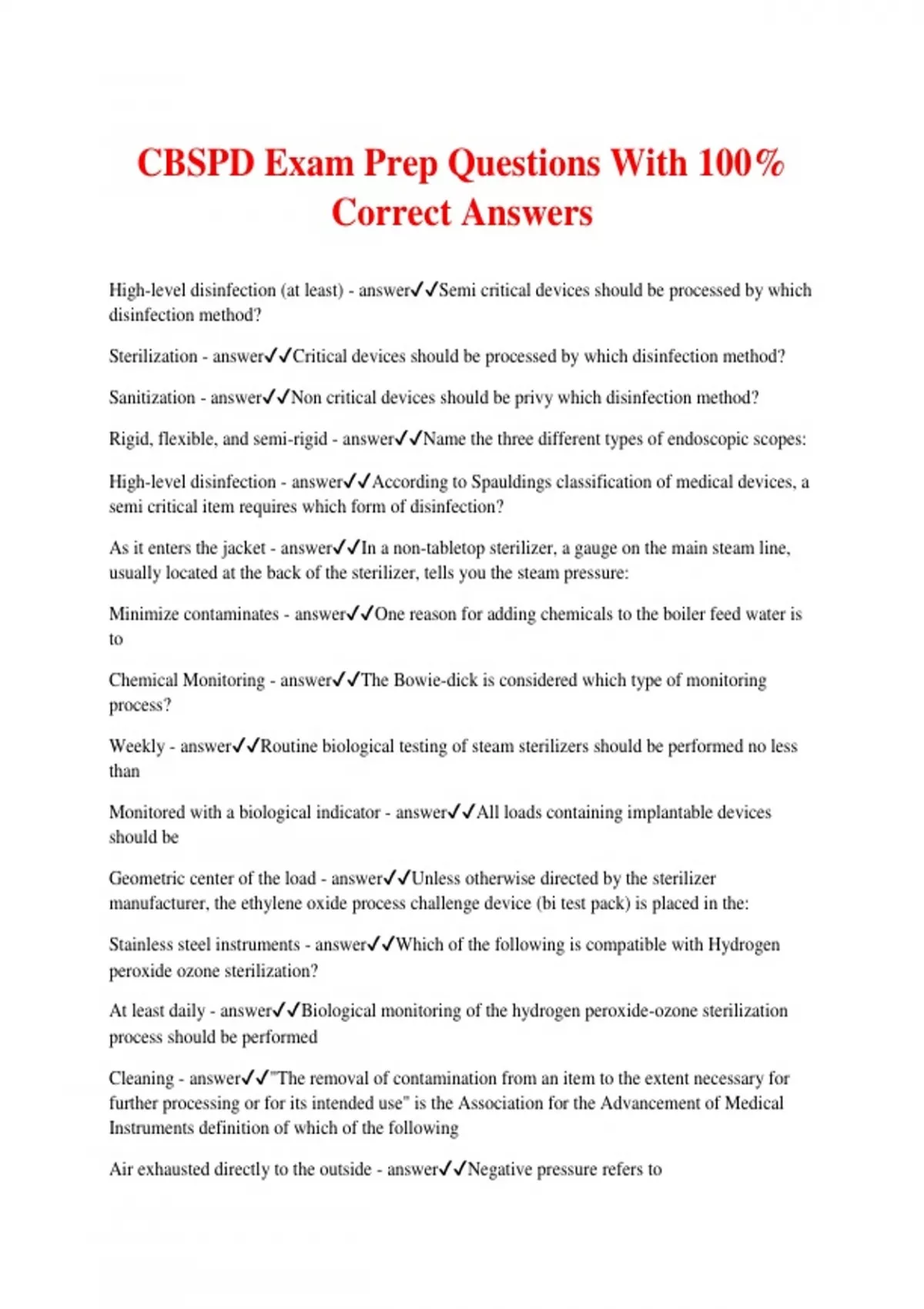 CBSPD Exam Prep Questions With 100% Correct Answers High-level disinfection (at least) - answerSemi critical devices should be processed by which disinfection method? Sterilization - answerCritical devices should be processed by which disinfection method? Sanitization - answerNon critical devices should be privy which disinfection method? Rigid, flexible, and semi-rigid - answerName the three different types of endoscopic scopes: High-level disinfection - answerAccording to Spauldings classification of medical devices, a semi critical item requires which form of disinfection? As it enters the jacket - answerIn a non-tabletop sterilizer, a gauge on the main steam line, usually located at the back of the sterilizer, tells you the steam pressure: Minimize contaminates - answerOne reason for adding chemicals to the boiler feed water is to Chemical Monitoring - answerThe Bowie-dick is considered which type of monitoring process? Weekly - answerRoutine biological testing of steam sterilizers should be performed no less than Monitored with a biological indicator - answerAll loads containing implantable devices should be Geometric center of the load - answerUnless otherwise directed by the sterilizer manufacturer, the ethylene oxide process challenge device (bi test pack) is placed in the: Stainless steel instruments - answerWhich of the following is compatible with Hydrogen peroxide ozone sterilization? At least daily - answerBiological monitoring of the hydrogen peroxide-ozone sterilization process should be performed Cleaning - answer"The removal of contamination from an item to the extent necessary for further processing or for its intended use" is the Association for the Advancement of Medical Instruments definition of which of the following Air exhausted directly to the outside - answerNegative pressure refers to Powered Equipment - answerWhen sorting items in the decontamination area, which of the following would require manual cleaning? Immunity - answerThe ability of the body to specifically counteract antigens refers to Measles - answerWhich of the following is not a disease spread by droplets? Vectors - answerLyme disease is generally transmitted by defense mechanisms - answerThe sterile processing technician does not have an impact on which of the following elements of the chain of infection? Time immersed, time taken out, temperature of the solution and initials of the technician who handled the instrument - answerWhen taking an instrument out of a HLD, what should be notated on the record log? At least 1 in - answerHow many inches of space should there be between the chamber walls and packages to prevent scorching of package materials? 90% - answerWhat is a log reduction of 1? 68-73 degrees/ 50%-35% - answerThe temperature/ humidity range in prep and pack should be: 3 to 3 1/2 minutes @ 270 or 273 with no drying time. - answerWhat is the cycle for specified for a Bowie-Dick test? Involves the use of external chemical indicators to verify that a load has been subjected to a sterilization process; the use of internal indicators to verify that individual packages have been exposed to necessary conditions for sterilization. - answerChemical monitoring: Verified that the sterilization conditions within the load were adequate to kill a known number of bacterial spores. - answerBiological monitoring Biological monitoring - answer- is the only way to measure the lethality of a sterilization process. Geobacillus stearothermophilus - answerThe spore that is most resistant to steam sterilization is Indicator tape - answerType 1 process indicators Bowie-dick - answerType 2: indicators for specific tests Single-variable indicators - answerType 3 Type 4 indicators - answerMulti-variable indicato
