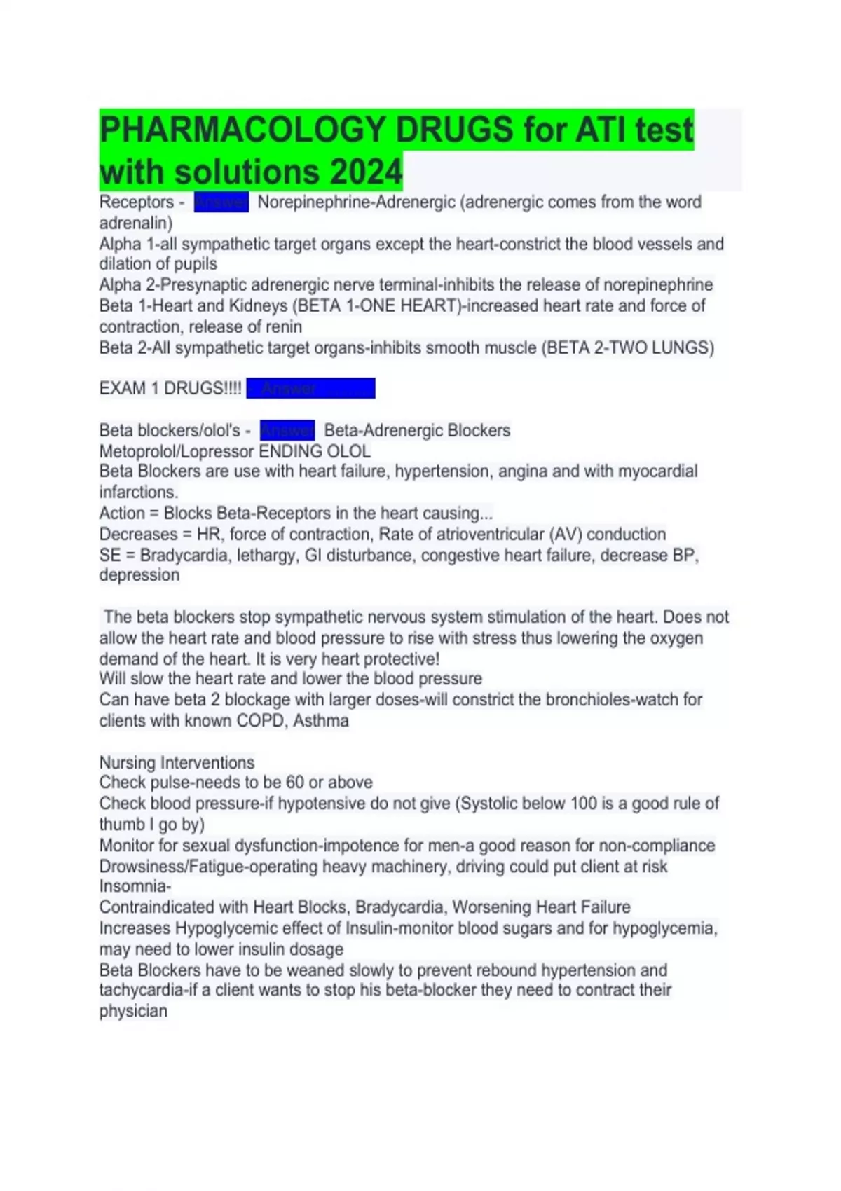 PHARMACOLOGY DRUGS for ATI test with solutions 2024