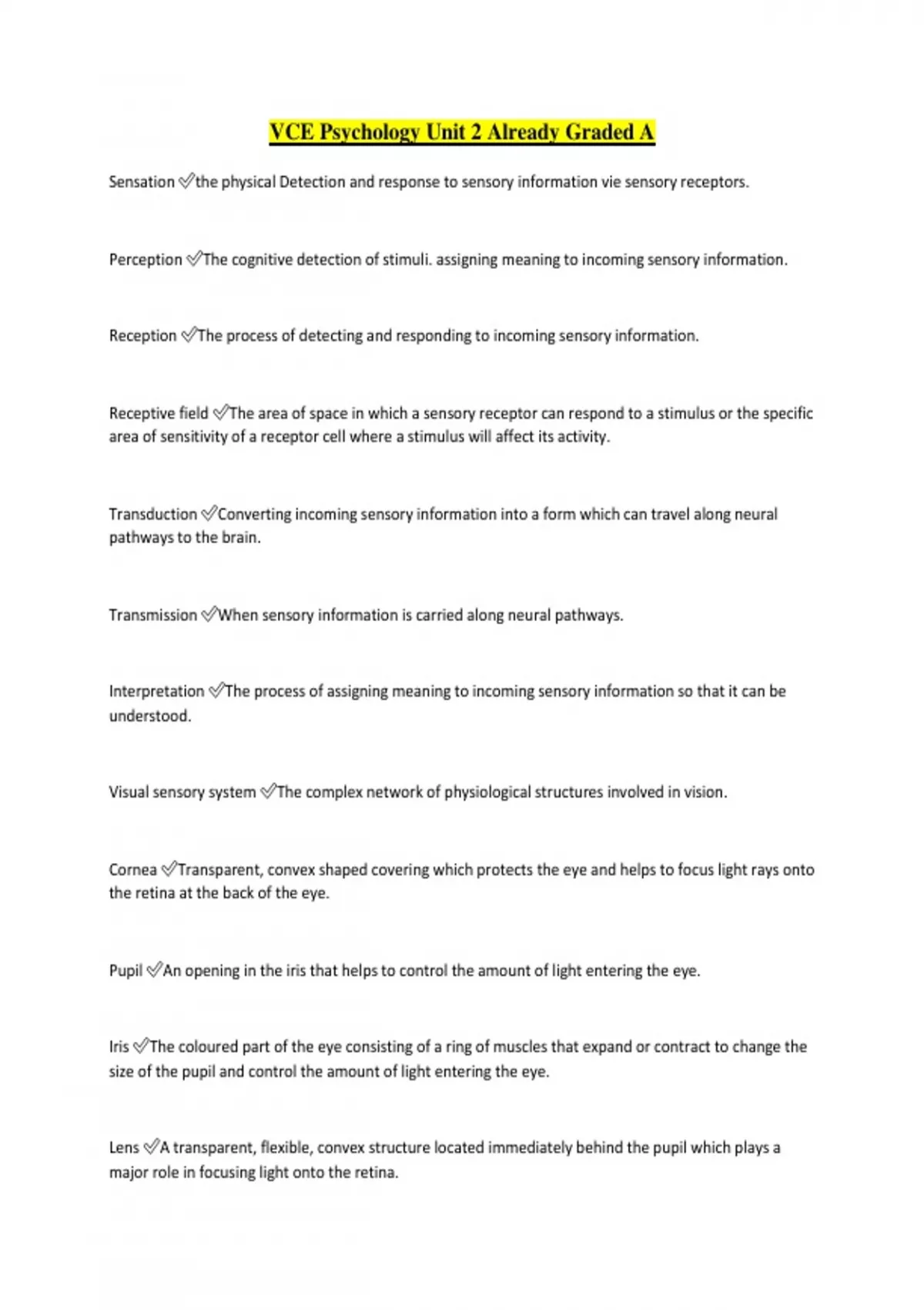 VCE Psychology Unit 2 Already Graded A Sensation the physical Detection and response to sensory information vie sensory receptors. Perception The cognitive detection of stimuli. assigning meaning to incoming sensory information. Reception The process of detecting and responding to incoming sensory information. Receptive field The area of space in which a sensory receptor can respond to a stimulus or the specific area of sensitivity of a receptor cell where a stimulus will affect its activity. Transduction Converting incoming sensory information into a form which can travel along neural pathways to the brain. Transmission When sensory information is carried along neural pathways. Interpretation The process of assigning meaning to incoming sensory information so that it can be understood. Visual sensory system The complex network of physiological structures involved in vision. Cornea Transparent, convex shaped covering which protects the eye and helps to focus light rays onto the retina at the back of the eye. Pupil An opening in the iris that helps to control the amount of light entering the eye. Iris The coloured part of the eye consisting of a ring of muscles that expand or contract to change the size of the pupil and control the amount of light entering the eye. Lens A transparent, flexible, convex structure located immediately behind the pupil which plays a major role in focusing light onto the retina. Retina Layer of neural tissue at the back of the eye that receives and absorbs light, and processes images for transmission to the brain. Photoreceptor A light sensitive visual receptors cell in the eye (rods and cones) Rod Photoreceptor in the eye's retina that responds to very low levels of light; primarily responsible for night vision. Cone Photoreceptor in the retina of the eye that responds to high levels of light and is primarily responsible for colour vision and detecting fine details. Optic nerve Transmits visual information from the retina to the primary visual cortex. Blind spot A small area on the retina at the back of the eye where there are no photoreceptors so light cannot be detected. Optic chiasm Point where the axons of ganglion cells in the optic nerve cross. Visual perception principle 'Rule' applied to visual information to assist organisation and interpretation of the information in consistent and meaningful ways. Gestalt principle of visual perception Organising the features of a visual scene to perceive a whole, complete form. Figure-ground In visual perception, organising visual information by perceptually dividing a visual scene into a 'figure', which stands out from the 'ground', which is its surroundings. Closure The perceptual tendency to mentally 'close up', fill in or ignore gaps in a visual image and to perceive objects as complete/Whole . Similarity The tendency to perceive parts of a visual image that have similar features, such as size, shape, texture or colour, as belonging together in a unit, group or 'whole'. Proximity The tendency to perceive parts of a visual image which are positioned close together as belonging together in a group. Depth perception The ability to accurately estimate the distance of objects and therefore perceive the world in three dimensions. Depth cue Source of information from the environment (external cue) or from within the body (internal cue) that assists perception of how far away objects are and therefore perceive depth, often classified as binocular or monocular. Binocular depth cue A depth (or distance) perception cue requiring the use of both eyes. Convergence A binocular visual perception depth cue involving the inward turning of the eyes to focus on nearby objects. Retinal disparity A binocular visual perception depth cue based on the difference (disparity) of the retinal images. Monocular depth cue A depth perception cue requiring the use of only one eye. Accommodation In visual perception, a depth cue involving the automatic focusing of the lens in the eye to adjust shape in response to changes in the distance of view from an object. Pictorial cue A visual perception depth cue that can be represented pictorially on a two-dimensional surface. Linear perspective A visual perception depth cue based on the apparent convergence of parallel lines as they recede into the distance. Interposition A visual perception depth cue based on the principle that an object which partially covers another object is closer than the object it covers and the covered object is further away. Also called overlap. Texture gradient A visual perception depth cue based on the extent to which fine detail can be perceived in a surface. Relative size The perceptual tendency to visually perceive the object that produces the largest image on the retina as being closer and the object that produces the smallest image as being further away (when objects are expected to be the same size). Height in the visual field The perceptual tendency to visually perceive objects closer to the horizon as being more distant than objects located further from the horizon Perceptual constancy the tendency to perceive an object as remaining stable and unchanging despite any changes that may occur to the image cast on the retina. Size constancy Recognising that an object's actual size remains the same, even though the size of the image it casts on the retina changes. Shape constancy The tendency to perceive an object as maintaining its shape despite any changes in the shape of the image on the retina. Perceptual set The predisposition to perceive something in accordance with expectations of what it is. Context The setting situation or environment in which an event occurs; in visual perception, the