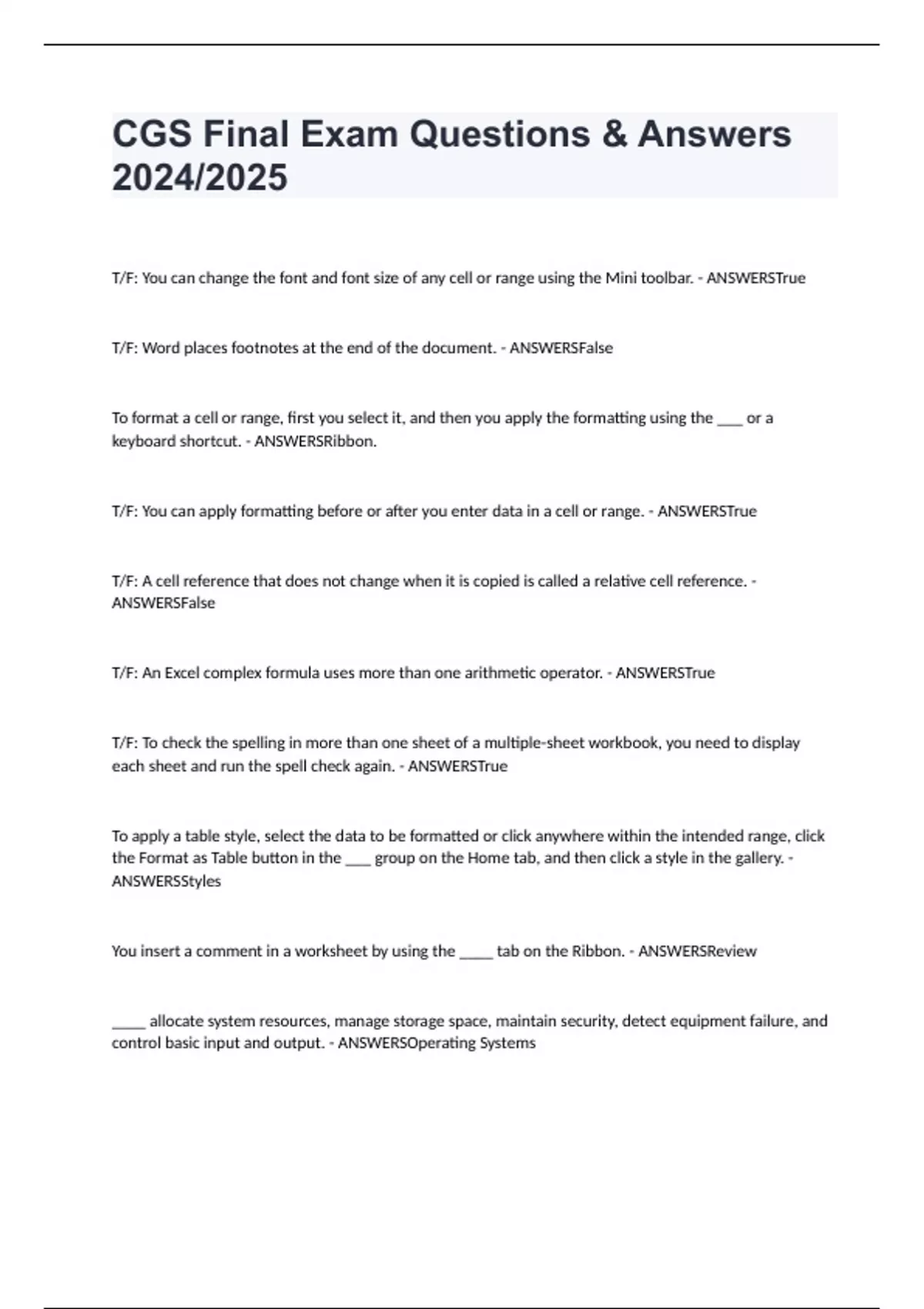 CGS Final Exam Questions & Answers 2024/2025 T/F: You can change the font and font size of any cell or range using the Mini toolbar. - ANSWERSTrue T/F: Word places footnotes at the end of the document. - ANSWERSFalse To format a cell or range, first you select it, and then you apply the formatting using the ___ or a keyboard shortcut. - ANSWERSRibbon. T/F: You can apply formatting before or after you enter data in a cell or range. - ANSWERSTrue T/F: A cell reference that does not change when it is copied is called a relative cell reference. - ANSWERSFalse T/F: An Excel complex formula uses more than one arithmetic operator. - ANSWERSTrue T/F: To check the spelling in more than one sheet of a multiple-sheet workbook, you need to display each sheet and run the spell check again. - ANSWERSTrue To apply a table style, select the data to be formatted or click anywhere within the intended range, click the Format as Table button in the ___ group on the Home tab, and then click a style in the gallery. - ANSWERSStyles You insert a comment in a worksheet by using the ____ tab on the Ribbon. - ANSWERSReview ____ allocate system resources, manage storage space, maintain security, detect equipment failure, and control basic input and output. - ANSWERSOperating Systems