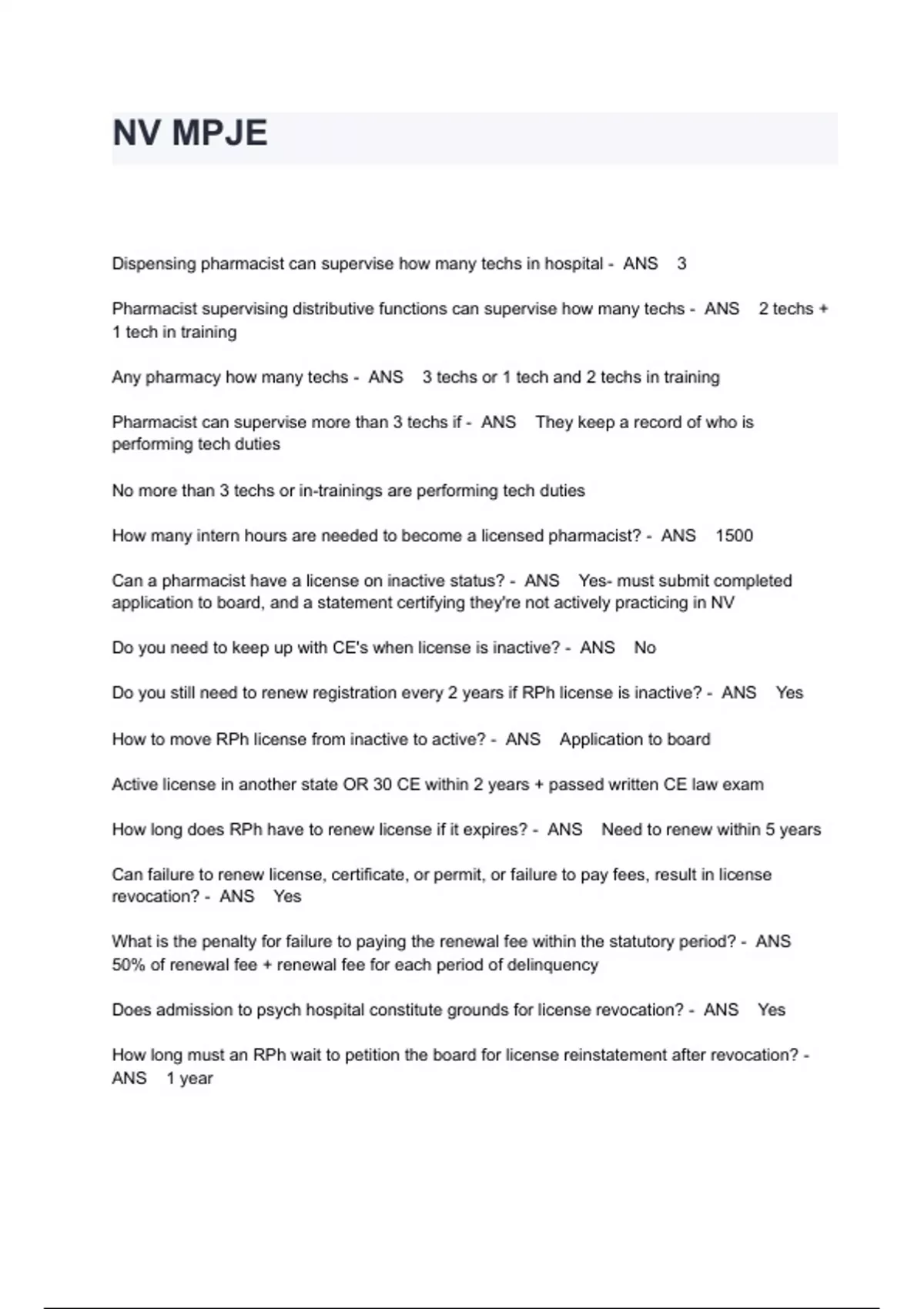 NV MPJE EXAM QUESTIONS AND ANSWERS Dispensing pharmacist can supervise how many techs in hospital - ANS 3 Pharmacist supervising distributive functions can supervise how many techs - ANS 2 techs + 1 tech in training Any pharmacy how many techs - ANS 3 techs or 1 tech and 2 techs in training Pharmacist can supervise more than 3 techs if - ANS They keep a record of who is performing tech duties No more than 3 techs or in-trainings are performing tech duties How many intern hours are needed to become a licensed pharmacist? - ANS 1500 Can a pharmacist have a license on inactive status? - ANS Yes- must submit completed application to board, and a statement certifying they're not actively practicing in NV Do you need to keep up with CE's when license is inactive? - ANS No Do you still need to renew registration every 2 years if RPh license is inactive? - ANS Yes How to move RPh license from inactive to active? - ANS Application to board Active license in another state OR 30 CE within 2 years + passed written CE law exam How long does RPh have to renew license if it expires? - ANS Need to renew within 5 years Can failure to renew license, certificate, or permit, or failure to pay fees, result in license revocation? - ANS Yes What is the penalty for failure to paying the renewal fee within the statutory period? - ANS 50% of renewal fee + renewal fee for each period of delinquency Does admission to psych hospital constitute grounds for license revocation? - ANS Yes How long must an RPh wait to petition the board for license reinstatement after revocation? - ANS 1 year