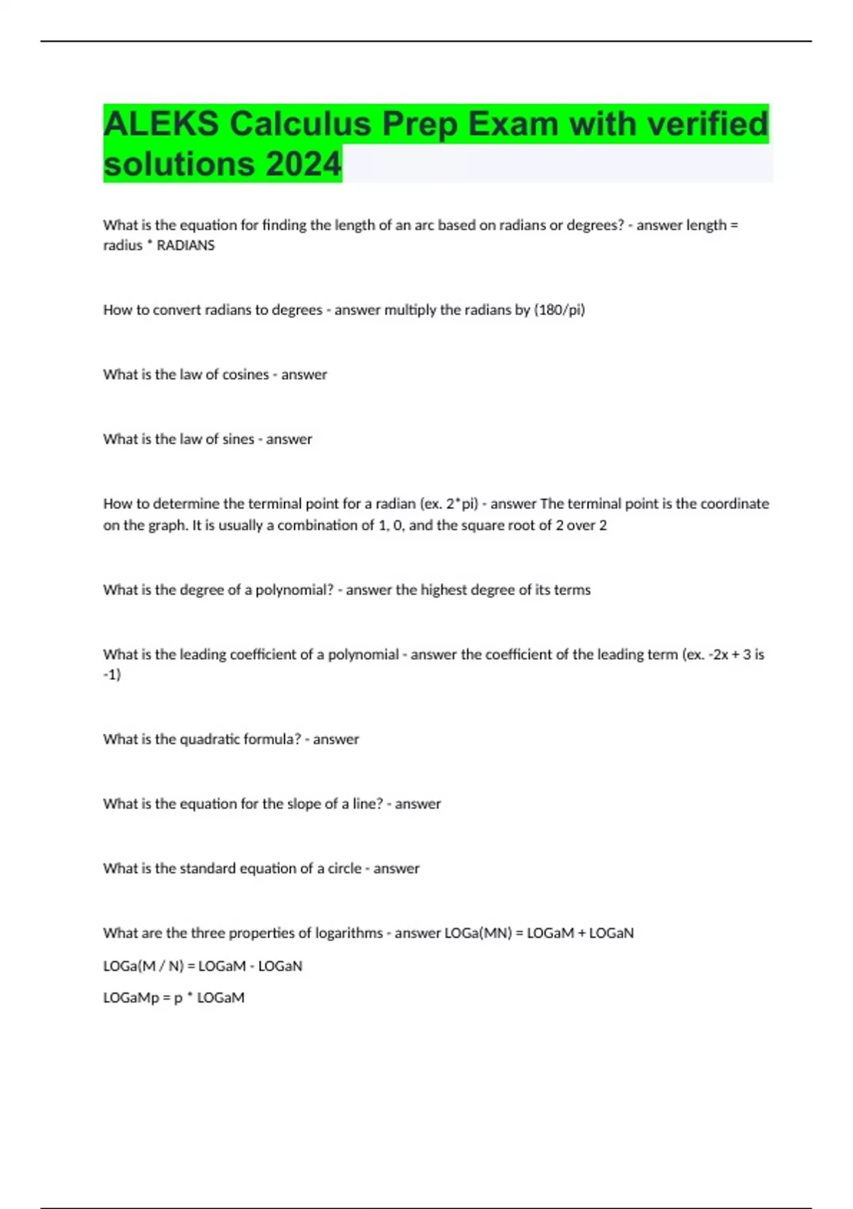 ALEKS Calculus Prep Exam with verified solutions 2024