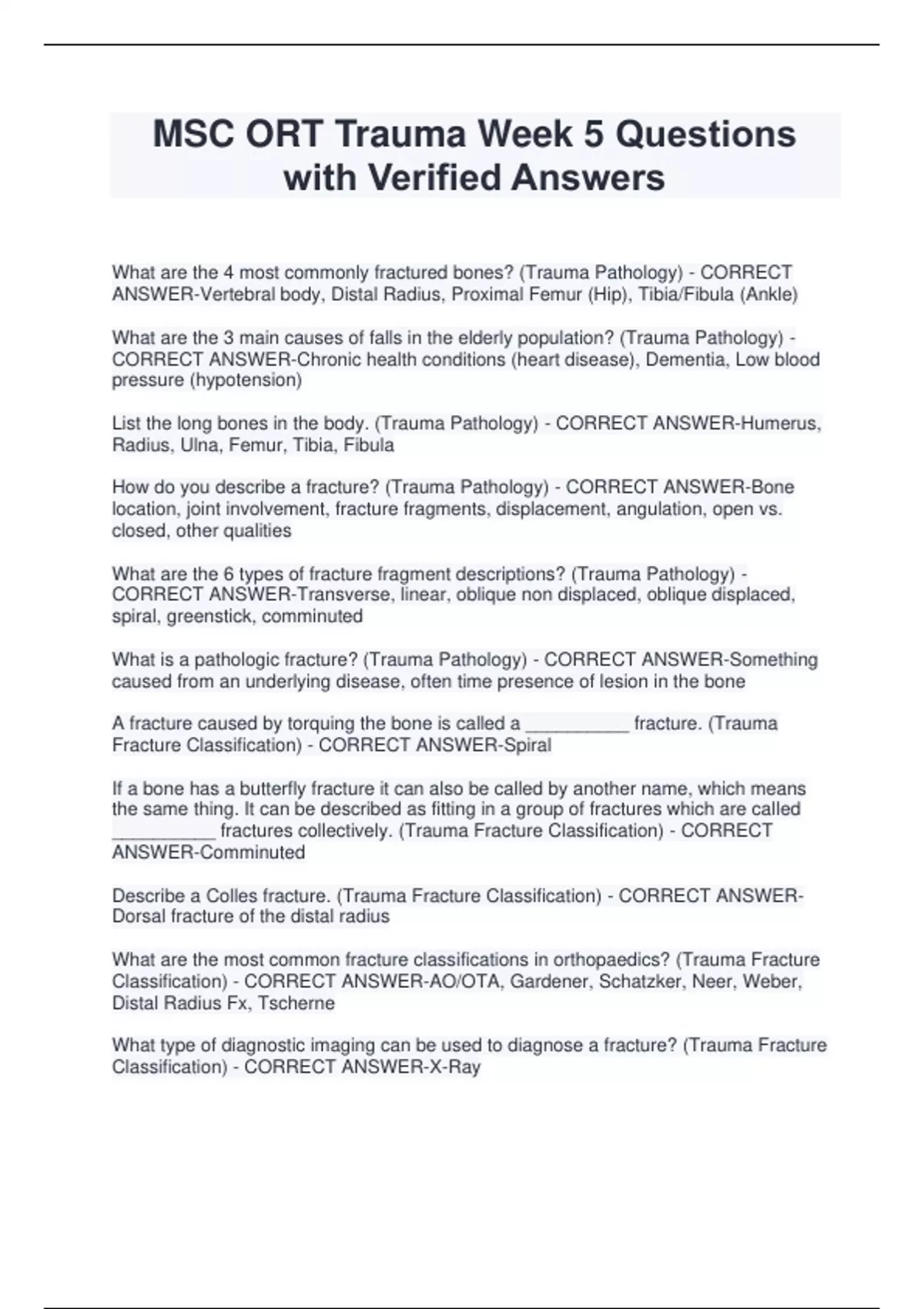 MSC ORT Trauma Week 5 Questions with Verified Answers What are the 4 most commonly fractured bones? (Trauma Pathology) - CORRECT ANSWER-Vertebral body, Distal Radius, Proximal Femur (Hip), Tibia/Fibula (Ankle) What are the 3 main causes of falls in the elderly population? (Trauma Pathology) - CORRECT ANSWER-Chronic health conditions (heart disease), Dementia, Low blood pressure (hypotension) List the long bones in the body. (Trauma Pathology) - CORRECT ANSWER-Humerus, Radius, Ulna, Femur, Tibia, Fibula How do you describe a fracture? (Trauma Pathology) - CORRECT ANSWER-Bone location, joint involvement, fracture fragments, displacement, angulation, open vs. closed, other qualities What are the 6 types of fracture fragment descriptions? (Trauma Pathology) - CORRECT ANSWER-Transverse, linear, oblique non displaced, oblique displaced, spiral, greenstick, comminuted What is a pathologic fracture? (Trauma Pathology) - CORRECT ANSWER-Something caused from an underlying disease, often time presence of lesion in the bone A fracture caused by torquing the bone is called a __________ fracture. (Trauma Fracture Classification) - CORRECT ANSWER-Spiral If a bone has a butterfly fracture it can also be called by another name, which means the same thing. It can be described as fitting in a group of fractures which are called __________ fractures collectively. (Trauma Fracture Classification) - CORRECT ANSWER-Comminuted Describe a Colles fracture. (Trauma Fracture Classification) - CORRECT ANSWERDorsal fracture of the distal radius What are the most common fracture classifications in orthopaedics? (Trauma Fracture Classification) - CORRECT ANSWER-AO/OTA, Gardener, Schatzker, Neer, Weber, Distal Radius Fx, Tscherne What type of diagnostic imaging can be used to diagnose a fracture? (Trauma Fracture Classification) - CORRECT ANSWER-X-Ray