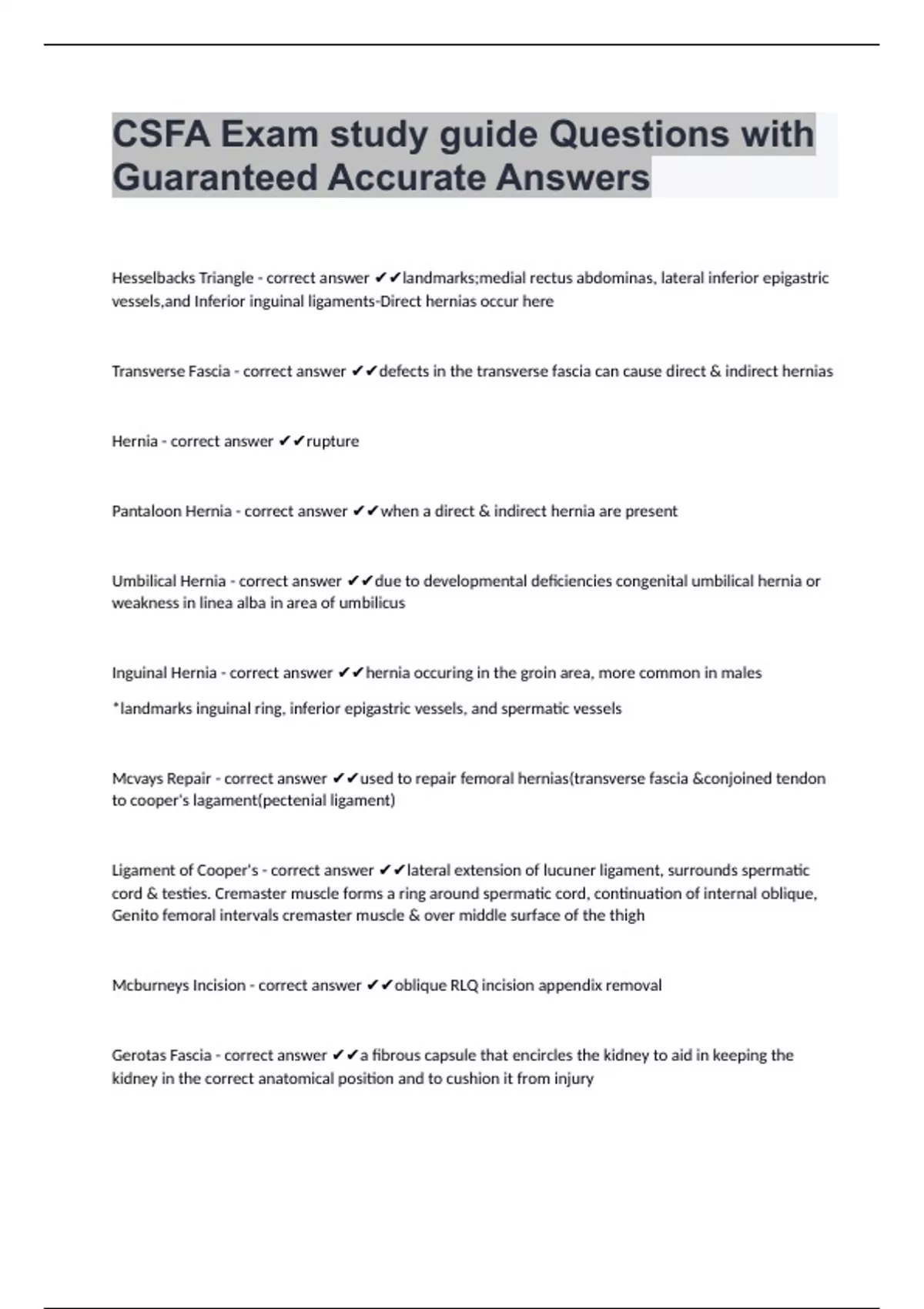 Hesselbacks Triangle - correct answer landmarks;medial rectus abdominas, lateral inferior epigastric vessels,and Inferior inguinal ligaments-Direct hernias occur here Transverse Fascia - correct answer defects in the transverse fascia can cause direct & indirect hernias Hernia - correct answer rupture Pantaloon Hernia - correct answer when a direct & indirect hernia are present Umbilical Hernia - correct answer due to developmental deficiencies congenital umbilical hernia or weakness in linea alba in area of umbilicus Inguinal Hernia - correct answer hernia occuring in the groin area, more common in males *landmarks inguinal ring, inferior epigastric vessels, and spermatic vessels Mcvays Repair - correct answer used to repair femoral hernias(transverse fascia &conjoined tendon to cooper's lagament(pectenial ligament) Ligament of Cooper's - correct answer lateral extension of lucuner ligament, surrounds spermatic cord & testies. Cremaster muscle forms a ring around spermatic cord, continuation of internal oblique, Genito femoral intervals cremaster muscle & over middle surface of the thigh Mcburneys Incision - correct answer oblique RLQ incision appendix removal Gerotas Fascia - correct answer a fibrous capsule that encircles the kidney to aid in keeping the kidney in the correct anatomical position and to cushion it from injury Kidneys live retroperitoneal with the ureters Nephroblastomas - correct answer Wilm's tumor(commonly found in children) Cause obstruction of the vena cava, hepatic veins or renal veins Open gallbladder Laparoscopic - correct answer dissected anti-grade Dissected retrograde Duodenum, jejunum, and ileum - correct answer make up small intestines Duodenum - correct answer first of small intestines where all food digestion is complete; associated with Brunner's gland; connects the pylori of the stomach to the jejunum Jejunum - correct answer absorption of digested foods, vitamins,& electrolytes; thick wall with larger lumen in diameter and more vascularity compared to ileum; color; deep red