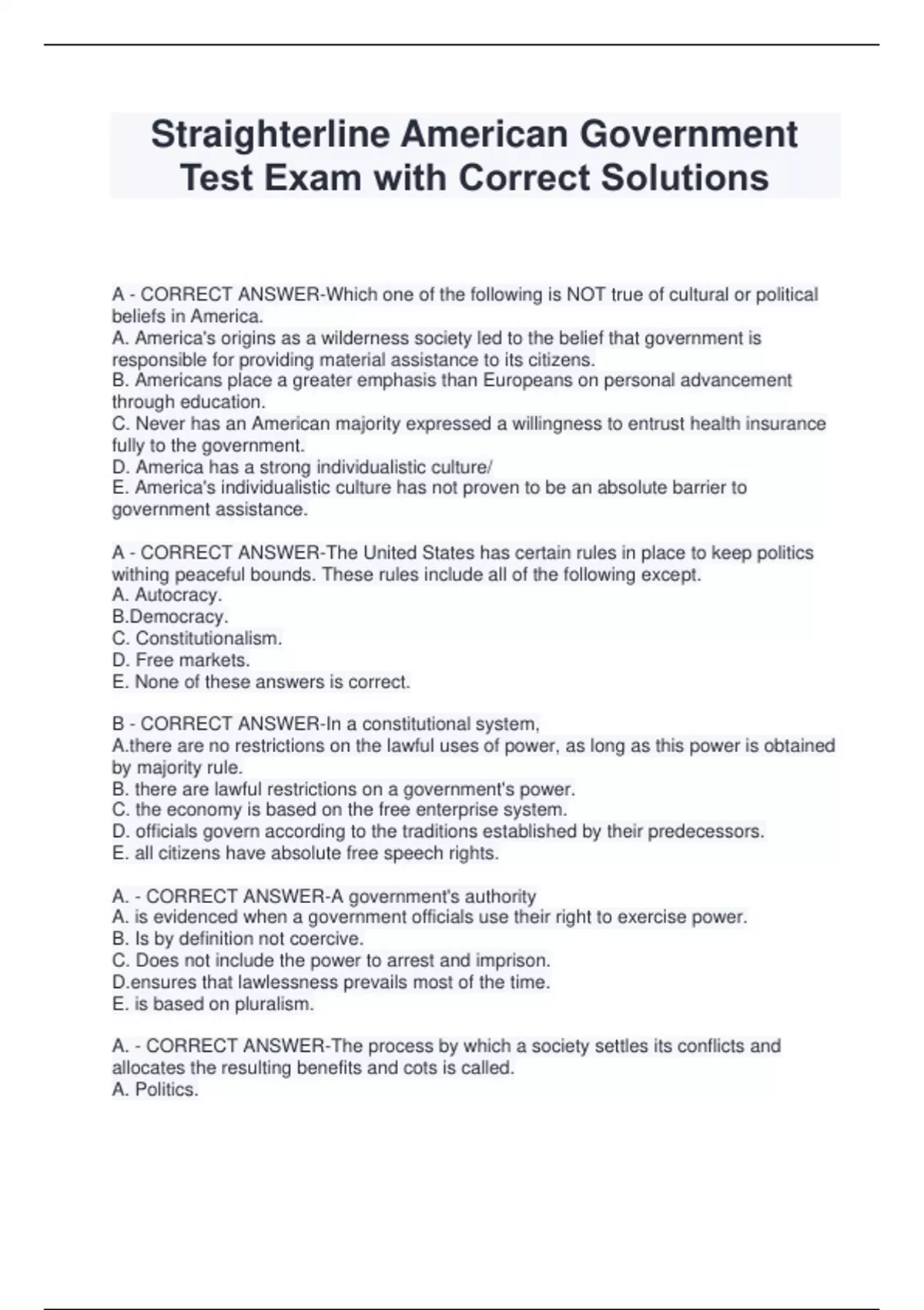 Straighterline American Government Test Exam with Correct Solutions A - CORRECT ANSWER-Which one of the following is NOT true of cultural or political beliefs in America. A. America's origins as a wilderness society led to the belief that government is responsible for providing material assistance to its citizens. B. Americans place a greater emphasis than Europeans on personal advancement through education. C. Never has an American majority expressed a willingness to entrust health insurance fully to the government. D. America has a strong individualistic culture/ E. America's individualistic culture has not proven to be an absolute barrier to government assistance. A - CORRECT ANSWER-The United States has certain rules in place to keep politics withing peaceful bounds. These rules include all of the following except. A. Autocracy. B.Democracy. C. Constitutionalism. D. Free markets. E. None of these answers is correct. B - CORRECT ANSWER-In a constitutional system, A.there are no restrictions on the lawful uses of power, as long as this power is obtained by majority rule. B. there are lawful restrictions on a government's power. C. the economy is based on the free enterprise system. D. officials govern according to the traditions established by their predecessors. E. all citizens have absolute free speech rights. A. - CORRECT ANSWER-A government's authority A. is evidenced when a government officials use their right to exercise power. B. Is by definition not coercive. C. Does not include the power to arrest and imprison. D.ensures that lawlessness prevails most of the time. E. is based on pluralism. A. - CORRECT ANSWER-The process by which a society settles its conflicts and allocates the resulting benefits and cots is called. A. Politics. B. Government. C. Elitism. D. Socialism. E. Communism. C. - CORRECT ANSWER-__________ is the ability of persons, groups, or institutions to influence political developments. A. Apathy. B. Politics. C. Power. D. Liberty. E. Political culture. B - CORRECT ANSWER-The Greek words demos and kratis together mean A. majority rule is sacred. B. the people rule. C. government is good. D. politics is immoral E. the king is good