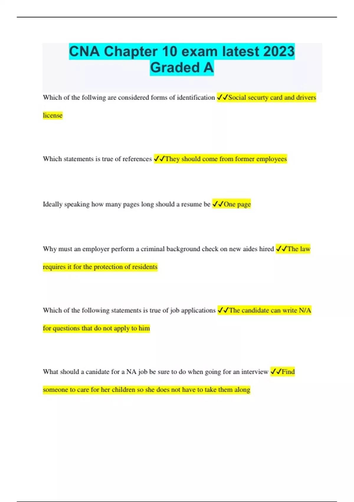 CNA Chapter 10 exam latest 2023 Graded A Which of the follwing are considered forms of identification Social securty card and drivers license Which statements is true of references They should come from former employees Ideally speaking how many pages long should a resume be One page Why must an employer perform a criminal background check on new aides hired The law requires it for the protection of residents Which of the following statements is true of job applications The candidate can write N/A for questions that do not apply to him What should a canidate for a NA job be sure to do when going for an interview Find someone to care for her children so she does not have to take them along