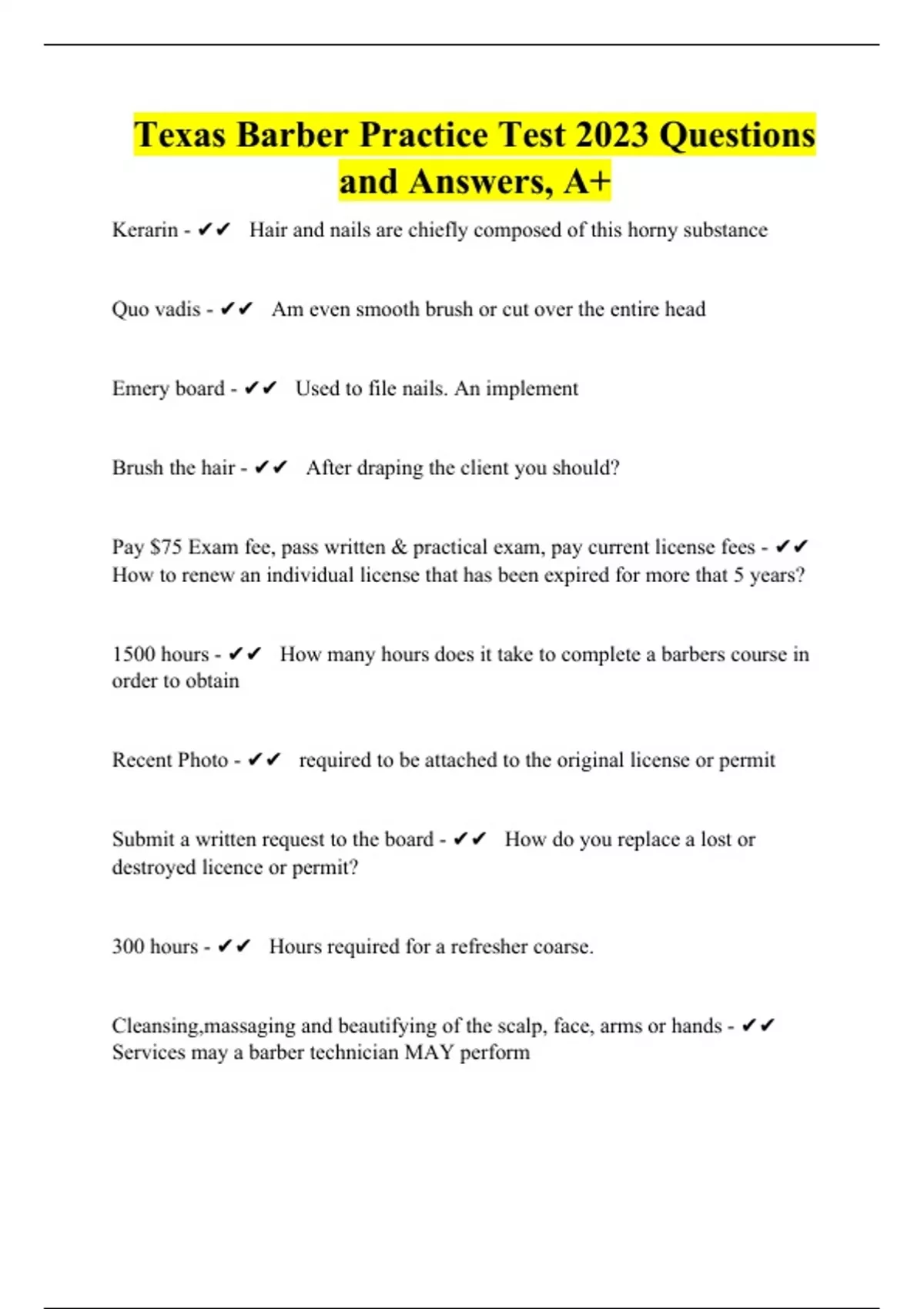 Texas Barber Practice Test 2023 Questions and Answers, A+