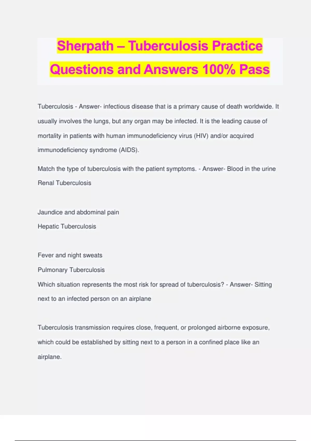 Sherpath – Tuberculosis Practice Questions and Answers 100% Pass