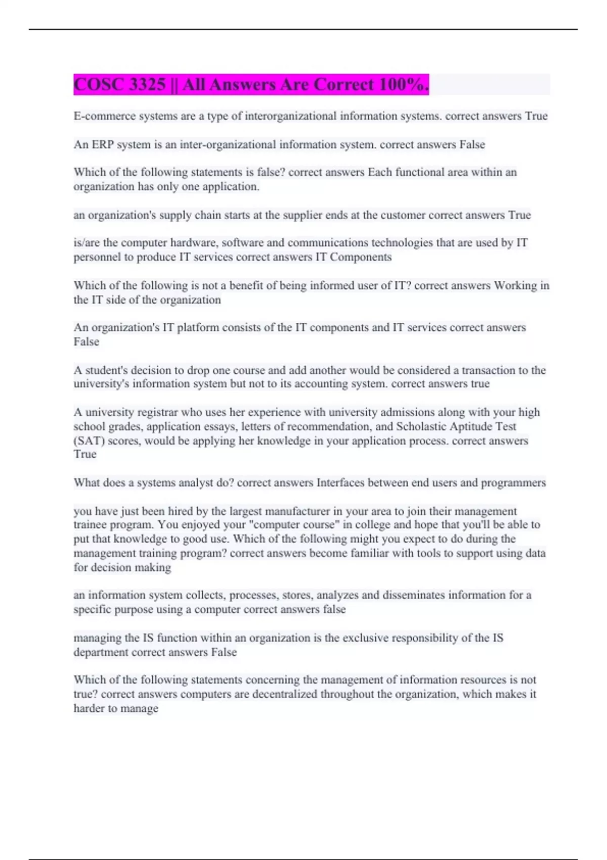 E-commerce systems are a type of interorganizational information systems. correct answers True An ERP system is an inter-organizational information system. correct answers False Which of the following statements is false? correct answers Each functional area within an organization has only one application. an organization's supply chain starts at the supplier ends at the customer correct answers True is/are the computer hardware, software and communications technologies that are used by IT personnel to produce IT services correct answers IT Components Which of the following is not a benefit of being informed user of IT? correct answers Working in the IT side of the organization An organization's IT platform consists of the IT components and IT services correct answers False A student's decision to drop one course and add another would be considered a transaction to the university's information system but not to its accounting system. correct answers true A university registrar who uses her experience with university admissions along with your high school grades, application essays, letters of recommendation, and Scholastic Aptitude Test (SAT) scores, would be applying her knowledge in your application process. correct answers True What does a systems analyst do? correct answers Interfaces between end users and programmers you have just been hired by the largest manufacturer in your area to join their management trainee program. You enjoyed your "computer course" in college and hope that you'll be able to put that knowledge to good use. Which of the following might you expect to do during the management training program? correct answers become familiar with tools to support using data for decision making an information system collects, processes, stores, analyzes and disseminates information for a specific purpose using a computer correct answers false managing the IS function within an organization is the exclusive responsibility of the IS department correct answers False Which of the following statements concerning the management of information resources is not true? correct answers computers are decentralized throughout the organization, which makes it harder to manage