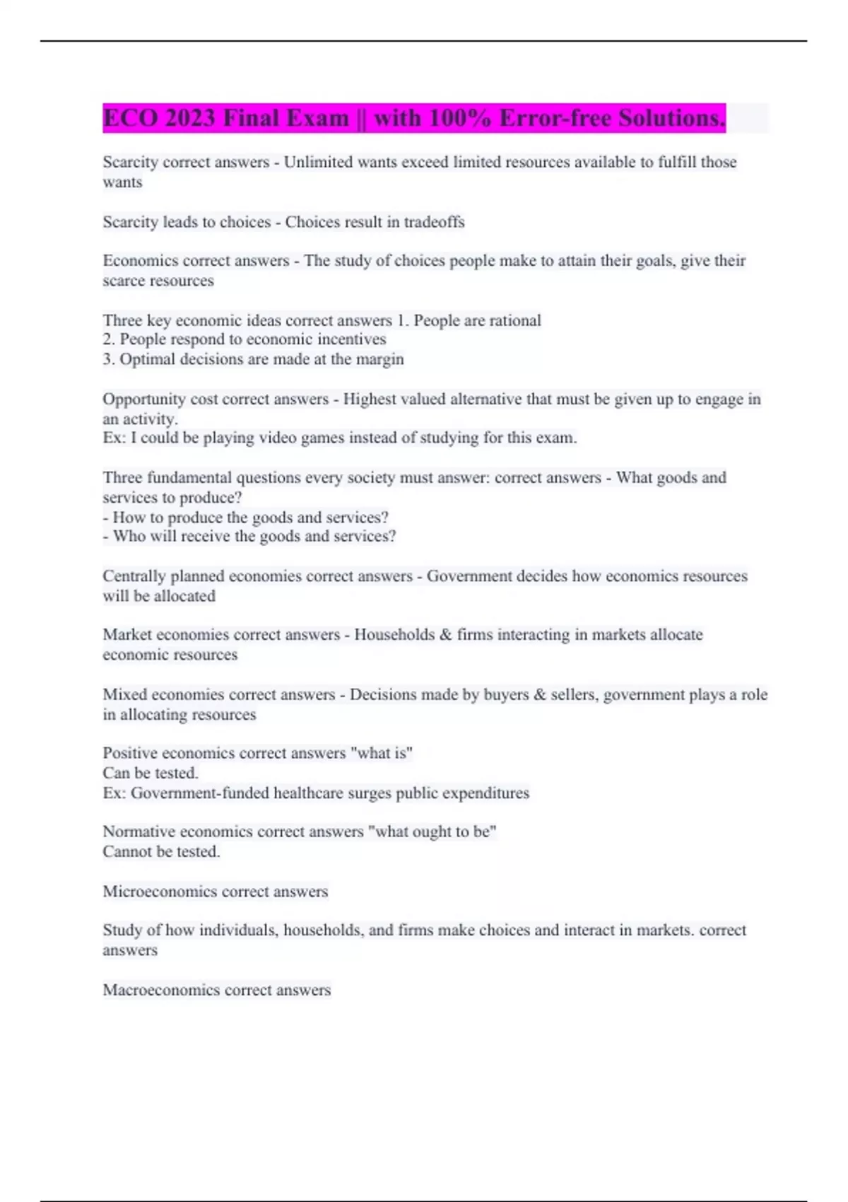 Scarcity correct answers - Unlimited wants exceed limited resources available to fulfill those wants Scarcity leads to choices - Choices result in tradeoffs Economics correct answers - The study of choices people make to attain their goals, give their scarce resources Three key economic ideas correct answers 1. People are rational 2. People respond to economic incentives 3. Optimal decisions are made at the margin Opportunity cost correct answers - Highest valued alternative that must be given up to engage in an activity. Ex: I could be playing video games instead of studying for this exam. Three fundamental questions every society must answer: correct answers - What goods and services to produce? - How to produce the goods and services? - Who will receive the goods and services? Centrally planned economies correct answers - Government decides how economics resources will be allocated Market economies correct answers - Households & firms interacting in markets allocate economic resources Mixed economies correct answers - Decisions made by buyers & sellers, government plays a role in allocating resources Positive economics correct answers "what is" Can be tested. Ex: Government-funded healthcare surges public expenditures Normative economics correct answers "what ought to be" Cannot be tested. Microeconomics correct answers Study of how individuals, households, and firms make choices and interact in markets. correct answers Macroeconomics correct answers