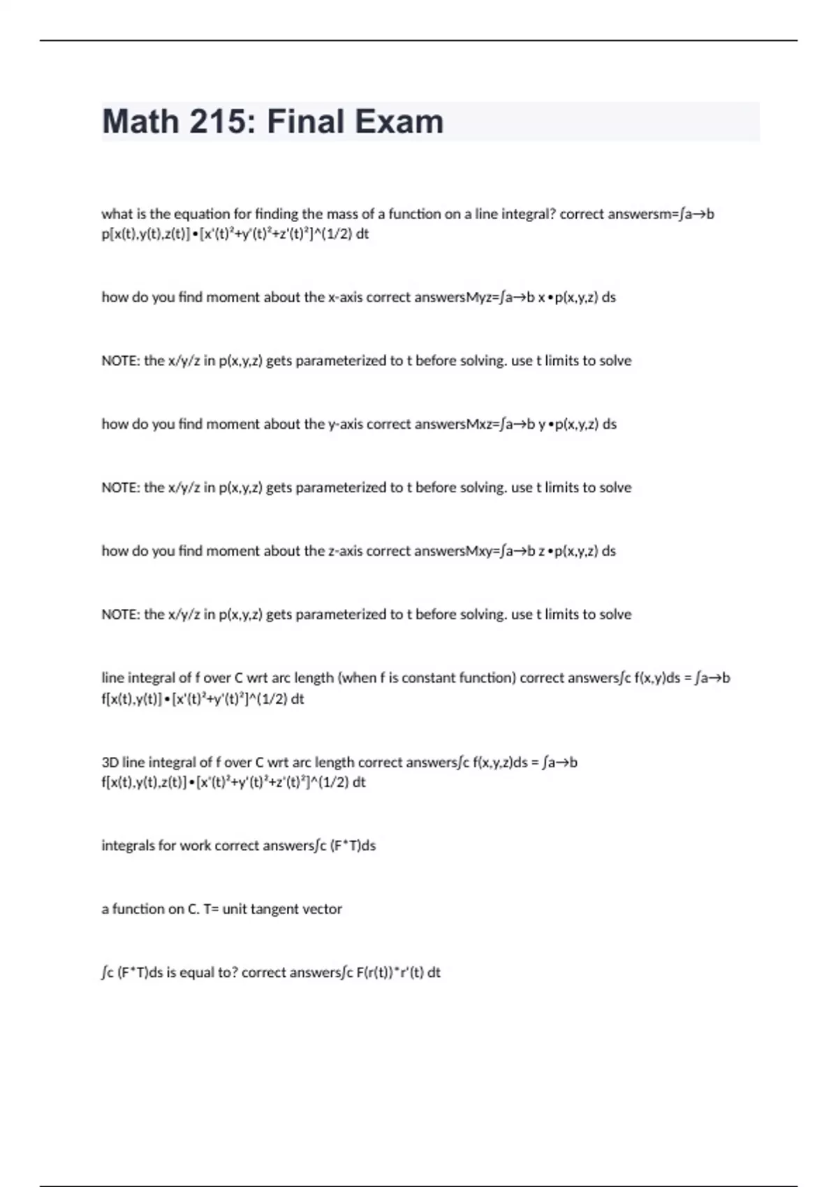 what is the equation for finding the mass of a function on a line integral? correct answersm=∫a→b p[x(t),y(t),z(t)]∙[x'(t)²+y'(t)²+z'(t)²]^(1/2) dt how do you find moment about the x-axis correct answersMyz=∫a→b x∙p(x,y,z) ds NOTE: the x/y/z in p(x,y,z) gets parameterized to t before solving. use t limits to solve how do you find moment about the y-axis correct answersMxz=∫a→b y∙p(x,y,z) ds NOTE: the x/y/z in p(x,y,z) gets parameterized to t before solving. use t limits to solve how do you find moment about the z-axis correct answersMxy=∫a→b z∙p(x,y,z) ds NOTE: the x/y/z in p(x,y,z) gets parameterized to t before solving. use t limits to solve line integral of f over C wrt arc length (when f is constant function) correct answers∫c f(x,y)ds = ∫a→b f[x(t),y(t)]∙[x'(t)²+y'(t)²]^(1/2) dt 3D line integral of f over C wrt arc length correct answers∫c f(x,y,z)ds = ∫a→b f[x(t),y(t),z(t)]∙[x'(t)²+y'(t)²+z'(t)²]^(1/2) dt integrals for work correct answers∫c (F*T)ds a function on C. T= unit tangent vector ∫c (F*T)ds is equal to? correct answers∫c F(r(t))*r'(t) dt