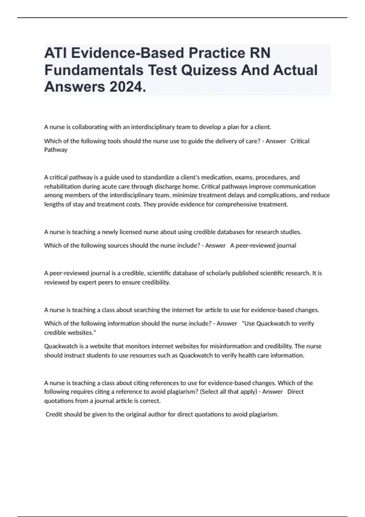 A nurse is collaborating with an interdisciplinary team to develop a plan for a client. Which of the following tools should the nurse use to guide the delivery of care? - Answer Critical Pathway A critical pathway is a guide used to standardize a client's medication, exams, procedures, and rehabilitation during acute care through discharge home. Critical pathways improve communication among members of the interdisciplinary team, minimize treatment delays and complications, and reduce lengths of stay and treatment costs. They provide evidence for comprehensive treatment. A nurse is teaching a newly licensed nurse about using credible databases for research studies. Which of the following sources should the nurse include? - Answer A peer-reviewed journal A peer-reviewed journal is a credible, scientific database of scholarly published scientific research. It is reviewed by expert peers to ensure credibility. A nurse is teaching a class about searching the internet for article to use for evidence-based changes. Which of the following information should the nurse include? - Answer "Use Quackwatch to verify credible websites." Quackwatch is a website that monitors internet websites for misinformation and credibility. The nurse should instruct students to use resources such as Quackwatch to verify health care information. A nurse is teaching a class about citing references to use for evidence-based changes. Which of the following requires citing a reference to avoid plagiarism? (Select all that apply) - Answer Direct quotations from a journal article is correct. Credit should be given to the original author for direct quotations to avoid plagiarism.
