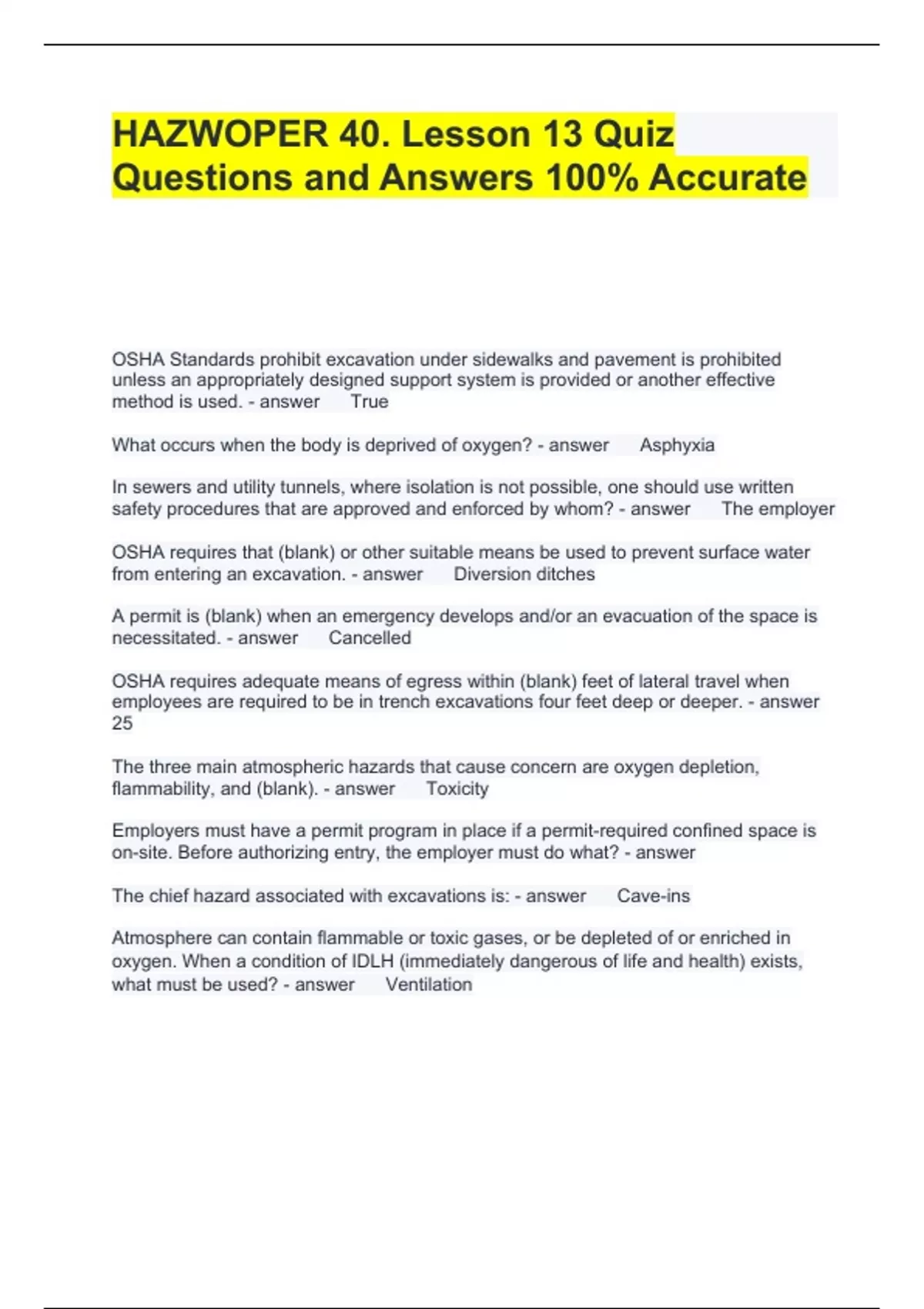 HAZWOPER 40. Lesson 13 Quiz Questions and Answers 100% Accurate OSHA Standards prohibit excavation under sidewalks and pavement is prohibited unless an appropriately designed support system is provided or another effective method is used. True What occurs when the body is deprived of oxygen? Asphyxia In sewers and utility tunnels, where isolation is not possible, one should use written safety procedures that are approved and enforced by whom? The employer OSHA requires that (blank) or other suitable means be used to prevent surface water from entering an excavation. Diversion ditches A permit is (blank) when an emergency develops and/or an evacuation of the space is necessitated. Cancelled OSHA requires adequate means of egress within (blank) feet of lateral travel when employees are required to be in trench excavations four feet deep or deeper. 25 The three main atmospheric hazards that cause concern are oxygen depletion, flammability, and (blank). Toxicity Employers must have a permit program in place if a permit-required confined space is on-site. Before authorizing entry, the employer must do what? The chief hazard associated with excavations is: Cave-ins Atmosphere can contain flammable or toxic gases, or be depleted of or enriched in oxygen. When a condition of IDLH (immediately dangerous of life and health) exists, what must be used? Ventilation
