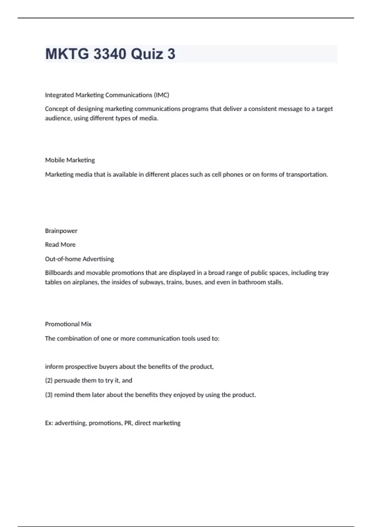 MKTG 3340 Quiz 3 Complete Test 2024. Integrated Marketing Communications (IMC) Concept of designing marketing communications programs that deliver a consistent message to a target audience, using different types of media. Mobile Marketing Marketing media that is available in different places such as cell phones or on forms of transportation. Brainpower Read More Out-of-home Advertising Billboards and movable promotions that are displayed in a broad range of public spaces, including tray tables on airplanes, the insides of subways, trains, buses, and even in bathroom stalls. Promotional Mix The combination of one or more communication tools used to: inform prospective buyers about the benefits of the product, (2) persuade them to try it, and (3) remind them later about the benefits they enjoyed by using the product. Ex: advertising, promotions, PR, direct marketing