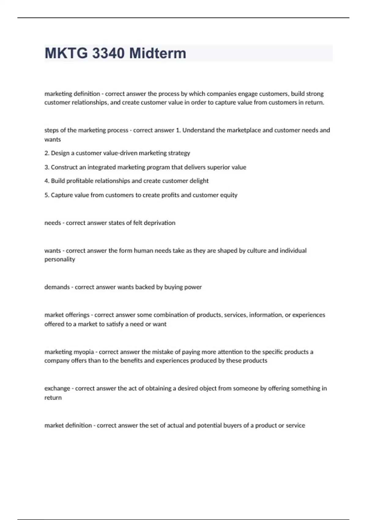MKTG 3340 Midterm Exam With Correct Answers 2024. marketing definition - correct answer the process by which companies engage customers, build strong customer relationships, and create customer value in order to capture value from customers in return. steps of the marketing process - correct answer 1. Understand the marketplace and customer needs and wants 2. Design a customer value-driven marketing strategy 3. Construct an integrated marketing program that delivers superior value 4. Build profitable relationships and create customer delight 5. Capture value from customers to create profits and customer equity needs - correct answer states of felt deprivation wants - correct answer the form human needs take as they are shaped by culture and individual personality demands - correct answer wants backed by buying power market offerings - correct answer some combination of products, services, information, or experiences offered to a market to satisfy a need or want marketing myopia - correct answer the mistake of paying more attention to the specific products a company offers than to the benefits and experiences produced by these products exchange - correct answer the act of obtaining a desired object from someone by offering something in return market definition - correct answer the set of actual and potential buyers of a product or service