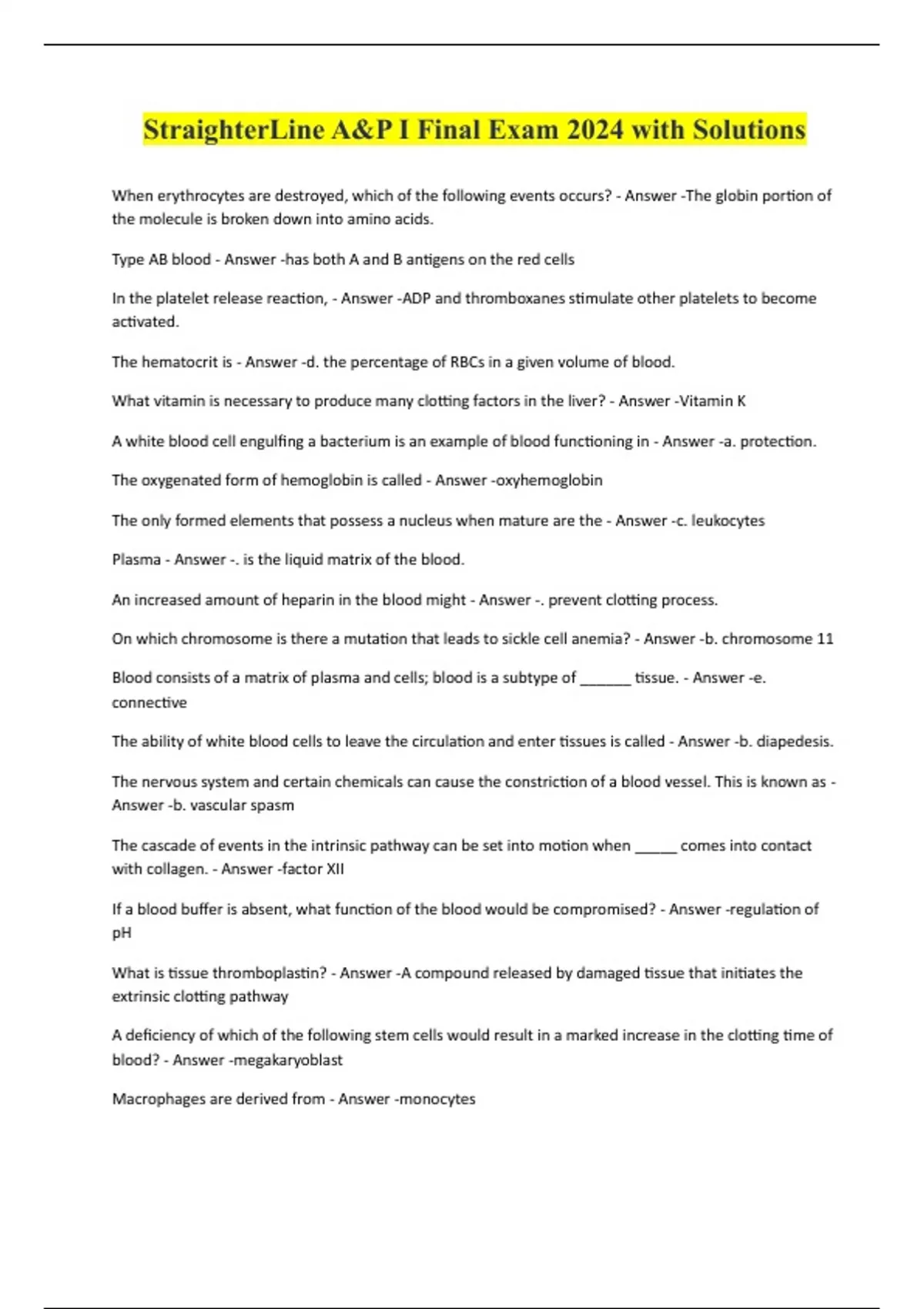 StraighterLine A&P I Final Exam 2024 with Solutions When erythrocytes are destroyed, which of the following events occurs? - Answer -The globin portion of the molecule is broken down into amino acids. Type AB blood - Answer -has both A and B antigens on the red cells In the platelet release reaction, - Answer -ADP and thromboxanes stimulate other platelets to become activated. The hematocrit is - Answer -d. the percentage of RBCs in a given volume of blood. What vitamin is necessary to produce many clotting factors in the liver? - Answer -Vitamin K A white blood cell engulfing a bacterium is an example of blood functioning in - Answer -a. protection. The oxygenated form of hemoglobin is called - Answer -oxyhemoglobin The only formed elements that possess a nucleus when mature are the - Answer -c. leukocytes Plasma - Answer -. is the liquid matrix of the blood. An increased amount of heparin in the blood might - Answer -. prevent clotting process. On which chromosome is there a mutation that leads to sickle cell anemia? - Answer -b. chromosome 11 Blood consists of a matrix of plasma and cells; blood is a subtype of ______ tissue. - Answer -e. connective The ability of white blood cells to leave the circulation and enter tissues is called - Answer -b. diapedesis. The nervous system and certain chemicals can cause the constriction of a blood vessel. This is known as - Answer -b. vascular spasm The cascade of events in the intrinsic pathway can be set into motion when _____ comes into contact with collagen. - Answer -factor XII If a blood buffer is absent, what function of the blood would be compromised? - Answer -regulation of pH What is tissue thromboplastin? - Answer -A compound released by damaged tissue that initiates the extrinsic clotting pathway A deficiency of which of the following stem cells would result in a marked increase in the clotting time of blood? - Answer -megakaryoblast Macrophages are derived from - Answer -monocytesWhich of the following events is one of the three main stages of coagulation? - Answer -conversion of fibrinogen to fibrin The "pacemaker" of the heart is the - Answer -SA node Where is blood moving during the period of ejection? - Answer -Ventricles to great vessels The adult heart averages ___________ grams. - Answer -250-