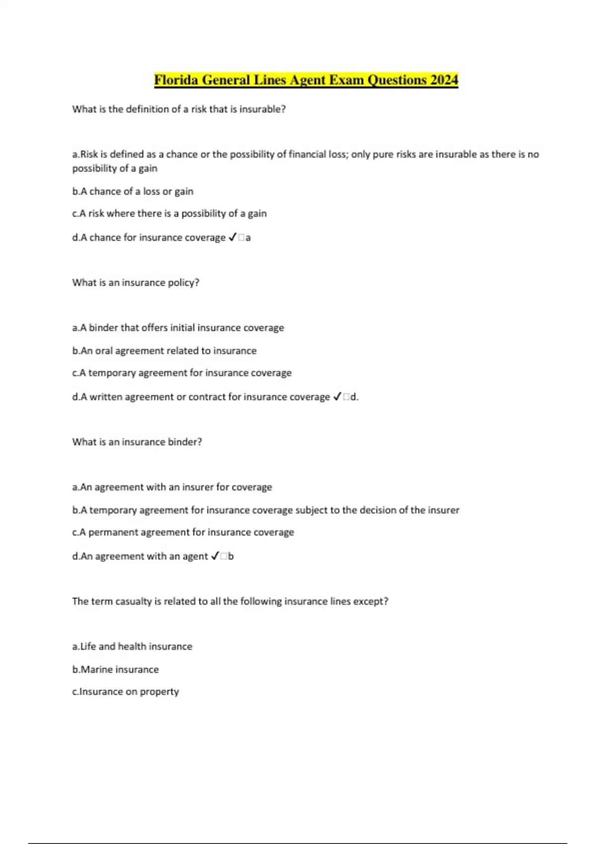 Florida General Lines Agent Exam Questions 2024 What is the definition of a risk that is insurable? a.Risk is defined as a chance or the possibility of financial loss; only pure risks are insurable as there is no possibility of a gain b.A chance of a loss or gain c.A risk where there is a possibility of a gain d.A chance for insurance coverage ️a What is an insurance policy? a.A binder that offers initial insurance coverage b.An oral agreement related to insurance c.A temporary agreement for insurance coverage d.A written agreement or contract for insurance coverage ️d. What is an insurance binder? a.An agreement with an insurer for coverage b.A temporary agreement for insurance coverage subject to the decision of the insurer c.A permanent agreement for insurance coverage d.An agreement with an agent ️b The term casualty is related to all the following insurance lines except? a.Life and health insurance b.Marine insurance c.Insurance on property d.Liability insurance ️a What is the mathematical concept where the actual results from an event being measured will equal the predicted or expected results as the number of units or trials increases? ️The concept of The Law of Large Numbers. What insurance principle acts to place an insured in the same or similar financial position after a loss as was prior to the loss event? a.The indemnity principle b.The waiver principle c.The principle of utmost good faith d.The principle of subrogation ️a What type of contract prevents an insured from transferring the interest of an insurance policy to another? a.A personal contract b.An indemnity contract c.A subrogation contract d.A contract of good faith ️a What type of contract is one where the obligation of the insurer is to perform the terms of the contract and is based on the insured satisfying certain conditions? a.A binding contract b.A personal contract c.A conditional contract d.An adhesion contract ️c What type of contract is it that the insured cannot negotiate the terms of the contract and must accept the terms specified in the contract? a.An indemnity contract b.A conditional contract c.A contract of adhesion d.A personal contract ️c What type of interest (financial or legal) in property must an insured have to benefit from a loss that is insured? a.Insurable interest b.An adhesion interest c.An indemnity interest d.A personal interest ️a What insurance doctrine states that a cause of a loss and all other directly related events flowing from the same cause of the loss would be considered as one event? a.The doctrine of insurable interest b.The doctrine of proximate cause c.The loss doctrine d.The doctrine of classification ️b John got in an accident that damaged his automobile, what would be considered as what type of loss?
