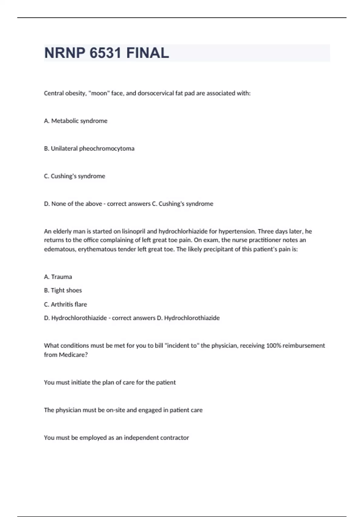 NRNP 6531 FINAL EXAM WITH CORRECT ANSWERS 2024. Central obesity, "moon" face, and dorsocervical fat pad are associated with: A. Metabolic syndrome B. Unilateral pheochromocytoma C. Cushing's syndrome D. None of the above - correct answers C. Cushing's syndrome An elderly man is started on lisinopril and hydrochlorhiazide for hypertension. Three days later, he returns to the office complaining of left great toe pain. On exam, the nurse practitioner notes an edematous, erythematous tender left great toe. The likely precipitant of this patient's pain is: A. Trauma B. Tight shoes C. Arthritis flare D. Hydrochlorothiazide - correct answers D. Hydrochlorothiazide What conditions must be met for you to bill "incident to" the physician, receiving 100% reimbursement from Medicare? You must initiate the plan of care for the patient The physician must be on-site and engaged in patient care You must be employed as an independent contractor