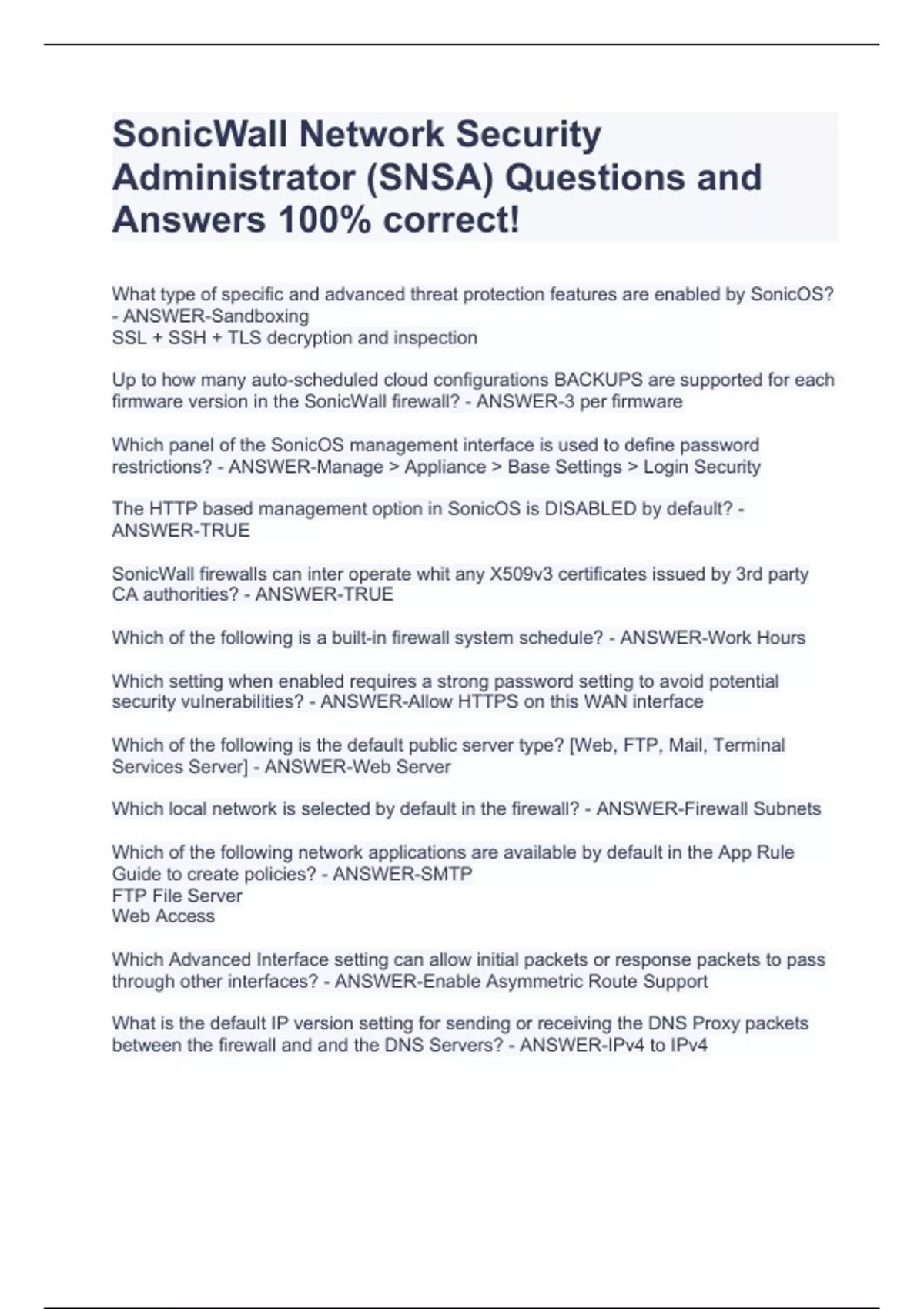 What type of specific and advanced threat protection features are enabled by SonicOS? - ANSWER-Sandboxing SSL + SSH + TLS decryption and inspection Up to how many auto-scheduled cloud configurations BACKUPS are supported for each firmware version in the SonicWall firewall? - ANSWER-3 per firmware Which panel of the SonicOS management interface is used to define password restrictions? - ANSWER-Manage > Appliance > Base Settings > Login Security The HTTP based management option in SonicOS is DISABLED by default? - ANSWER-TRUE SonicWall firewalls can inter operate whit any X509v3 certificates issued by 3rd party CA authorities? - ANSWER-TRUE Which of the following is a built-in firewall system schedule? - ANSWER-Work Hours Which setting when enabled requires a strong password setting to avoid potential security vulnerabilities? - ANSWER-Allow HTTPS on this WAN interface Which of the following is the default public server type? [Web, FTP, Mail, Terminal Services Server] - ANSWER-Web Server Which local network is selected by default in the firewall? - ANSWER-Firewall Subnets Which of the following network applications are available by default in the App Rule Guide to create policies? - ANSWER-SMTP FTP File Server Web Access Which Advanced Interface setting can allow initial packets or response packets to pass through other interfaces? - ANSWER-Enable Asymmetric Route Support What is the default IP version setting for sending or receiving the DNS Proxy packets between the firewall and and the DNS Servers? - ANSWER-IPv4 to IPv4 Which option is a messaging protocol that is used to build a cache of dynamic entries for IPv6 devices? - ANSWER-Neighbor Discovery Which MAC-IP Anti-Spoof network setting prevents any spoofing of the egress packets by a bad device or unwanted ARP packets? - ANSWER-ARP Lock