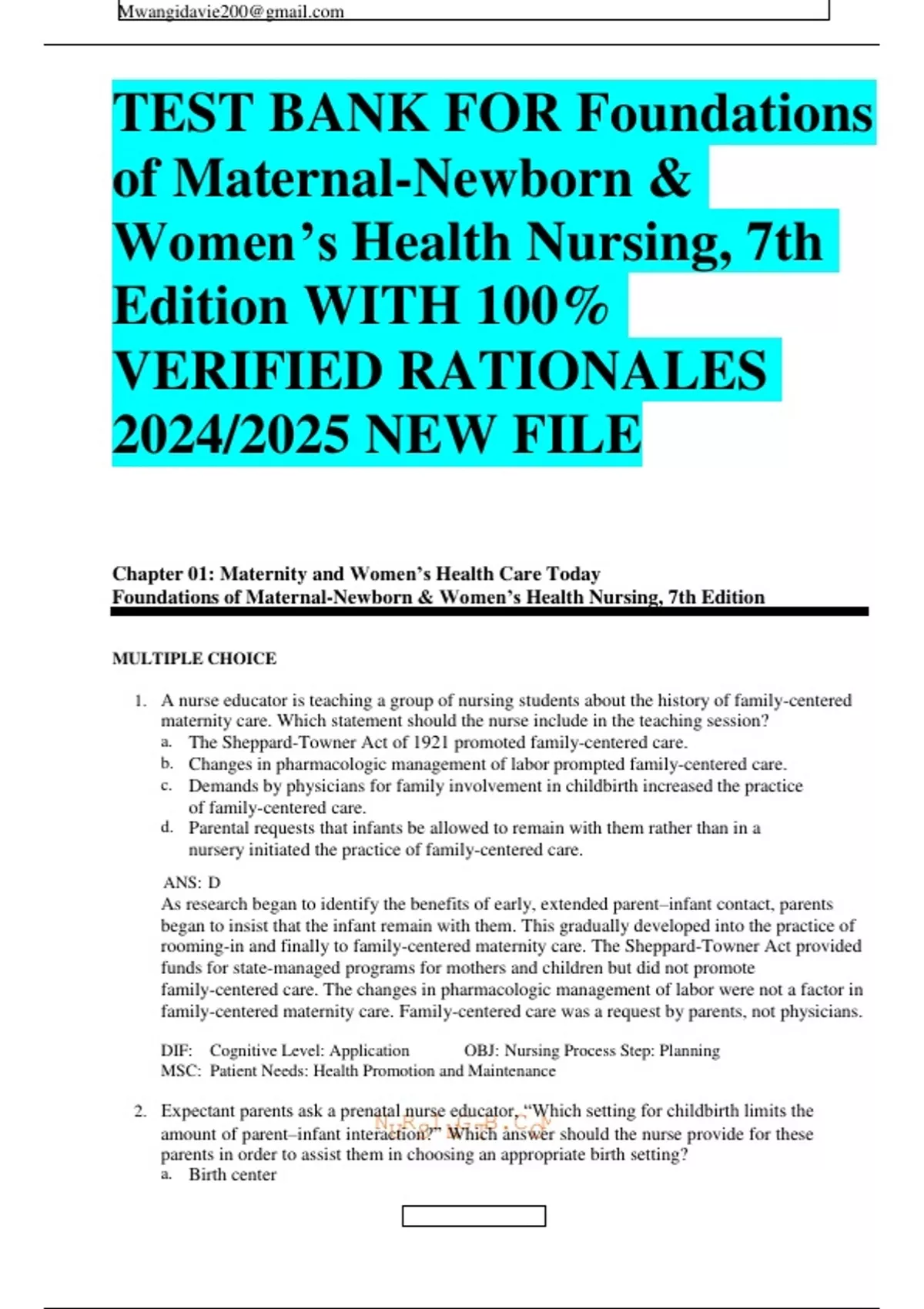 TEST BANK FOR Foundations of Maternal-Newborn & Women’s Health Nursing, 7th Edition WITH 100% VERIFIED RATIONALES 2024/2025 NEW FILE