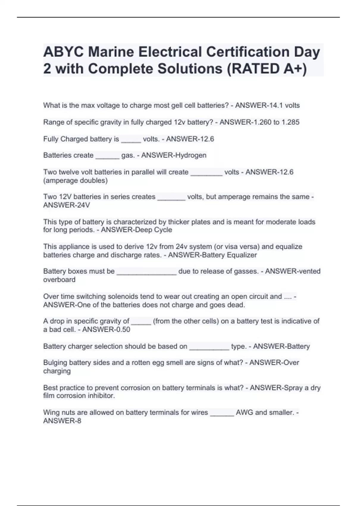 ABYC Marine Electrical Certification Day 2 with Complete Solutions (RATED A+) What is the max voltage to charge most gell cell batteries? - ANSWER-14.1 volts Range of specific gravity in fully charged 12v battery? - ANSWER-1.260 to 1.285 Fully Charged battery is _____ volts. - ANSWER-12.6 Batteries create ______ gas. - ANSWER-Hydrogen Two twelve volt batteries in parallel will create ________ volts - ANSWER-12.6 (amperage doubles) Two 12V batteries in series creates _______ volts, but amperage remains the same - ANSWER-24V This type of battery is characterized by thicker plates and is meant for moderate loads for long periods. - ANSWER-Deep Cycle This appliance is used to derive 12v from 24v system (or visa versa) and equalize batteries charge and discharge rates. - ANSWER-Battery Equalizer Battery boxes must be _______________ due to release of gasses. - ANSWER-vented overboard Over time switching solenoids tend to wear out creating an open circuit and .... - ANSWER-One of the batteries does not charge and goes dead. A drop in specific gravity of _____ (from the other cells) on a battery test is indicative of a bad cell. - ANSWER-0.50 Battery charger selection should be based on __________ type. - ANSWER-Battery Bulging battery sides and a rotten egg smell are signs of what? - ANSWER-Over charging Best practice to prevent corrosion on battery terminals is what? - ANSWER-Spray a dry film corrosion inhibitor.