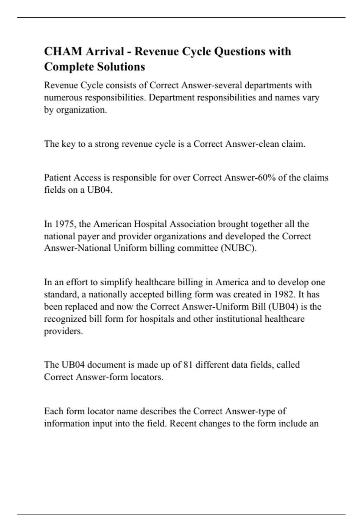 CHAM Arrival - Revenue Cycle Questions with Complete Solutions