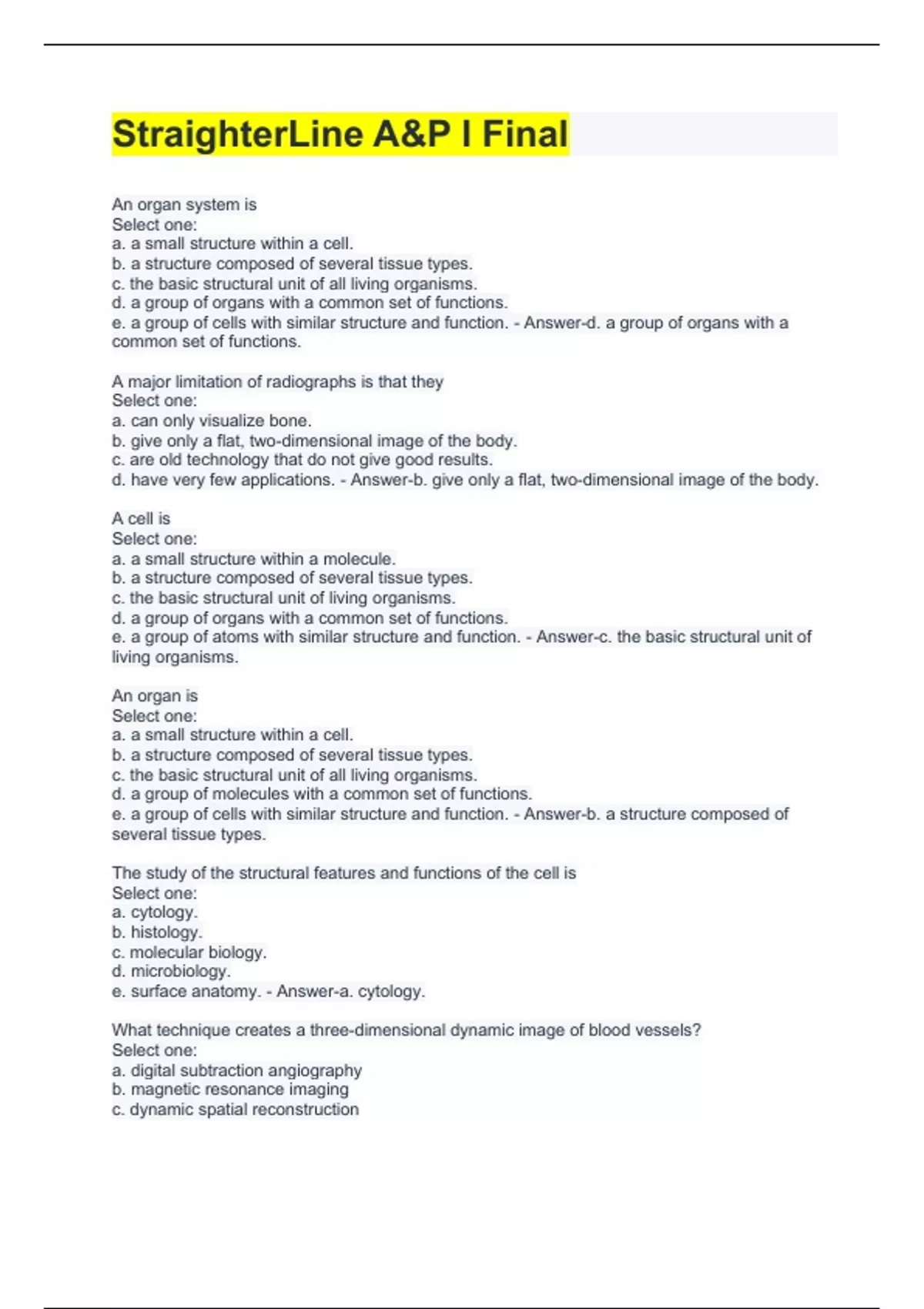 StraighterLine A&P I Final An organ system is Select one: a. a small structure within a cell. b. a structure composed of several tissue types. c. the basic structural unit of all living organisms. d. a group of organs with a common set of functions. e. a group of cells with similar structure and function. - Answer-d. a group of organs with a common set of functions. A major limitation of radiographs is that they Select one: a. can only visualize bone. b. give only a flat, two-dimensional image of the body. c. are old technology that do not give good results. d. have very few applications. - Answer-b. give only a flat, two-dimensional image of the body. A cell is Select one: a. a small structure within a molecule. b. a structure composed of several tissue types. c. the basic structural unit of living organisms. d. a group of organs with a common set of functions. e. a group of atoms with similar structure and function. - Answer-c. the basic structural unit of living organisms. An organ is Select one: a. a small structure within a cell. b. a structure composed of several tissue types. c. the basic structural unit of all living organisms. d. a group of molecules with a common set of functions. e. a group of cells with similar structure and function. - Answer-b. a structure composed of several tissue types. The study of the structural features and functions of the cell is Select one: a. cytology. b. histology. c. molecular biology. d. microbiology. e. surface anatomy. - Answer-a. cytology. What technique creates a three-dimensional dynamic image of blood vessels? Select one: a. digital subtraction angiography b. magnetic resonance imaging c. dynamic spatial reconstruction d. positron emission tomography - Answer-a. digital subtraction angiography Which subdivision of anatomy involves the study of organs that function together? Select one: a. regional b. developmental