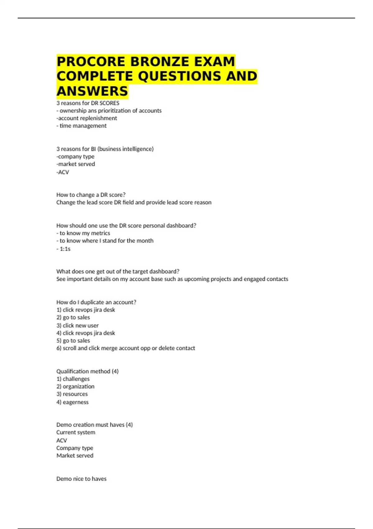 PROCORE BRONZE EXAM COMPLETE QUESTIONS AND ANSWERS 3 reasons for DR SCORES - ownership ans prioritization of accounts -account replenishment - time management 3 reasons for BI (business intelligence) -company type -market served -ACV How to change a DR score? Change the lead score DR field and provide lead score reason How should one use the DR score personal dashboard? - to know my metrics - to know where I stand for the month - 1:1s What does one get out of the target dashboard? See important details on my account base such as upcoming projects and engaged contacts How do I duplicate an account? 1) click revops jira desk 2) go to sales 3) click new user 4) click revops jira desk 5) go to sales 6) scroll and click merge account opp or delete contact Qualification method (4) 1) challenges 2) organization 3) resources 4) eagerness Demo creation must haves (4) Current system ACV Company type Market served Demo nice to haves Project types/ # Competitors
