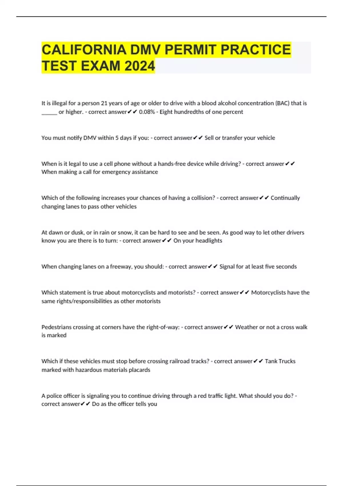 CALIFORNIA DMV PERMIT PRACTICE TEST EXAM 2024 It is illegal for a person 21 years of age or older to drive with a blood alcohol concentration (BAC) that is _____ or higher. - correct answer 0.08% - Eight hundredths of one percent You must notify DMV within 5 days if you: - correct answer Sell or transfer your vehicle When is it legal to use a cell phone without a hands-free device while driving? - correct answer When making a call for emergency assistance Which of the following increases your chances of having a collision? - correct answer Continually changing lanes to pass other vehicles At dawn or dusk, or in rain or snow, it can be hard to see and be seen. As good way to let other drivers know you are there is to turn: - correct answer On your headlights When changing lanes on a freeway, you should: - correct answer Signal for at least five seconds Which statement is true about motorcyclists and motorists? - correct answer Motorcyclists have the same rights/responsibilities as other motorists Pedestrians crossing at corners have the right-of-way: - correct answer Weather or not a cross walk is marked