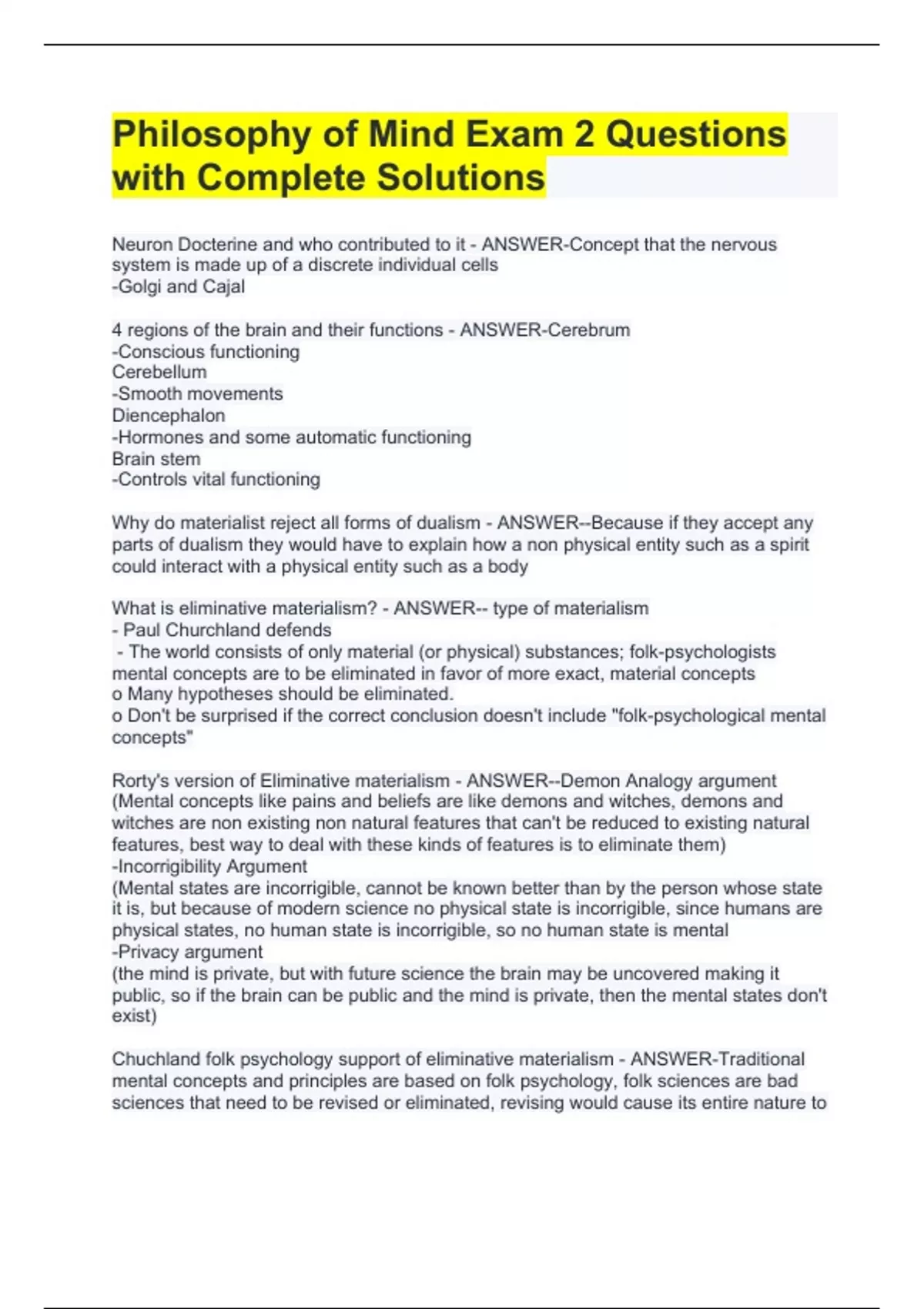Neuron Docterine and who contributed to it - ANSWER-Concept that the nervous system is made up of a discrete individual cells -Golgi and Cajal 4 regions of the brain and their functions - ANSWER-Cerebrum -Conscious functioning Cerebellum -Smooth movements Diencephalon -Hormones and some automatic functioning Brain stem -Controls vital functioning Why do materialist reject all forms of dualism - ANSWER--Because if they accept any parts of dualism they would have to explain how a non physical entity such as a spirit could interact with a physical entity such as a body What is eliminative materialism? - ANSWER-- type of materialism - Paul Churchland defends - The world consists of only material (or physical) substances; folk-psychologists mental concepts are to be eliminated in favor of more exact, material concepts o Many hypotheses should be eliminated. o Don't be surprised if the correct conclusion doesn't include "folk-psychological mental concepts" Rorty's version of Eliminative materialism - ANSWER--Demon Analogy argument (Mental concepts like pains and beliefs are like demons and witches, demons and witches are non existing non natural features that can't be reduced to existing natural features, best way to deal with these kinds of features is to eliminate them) -Incorrigibility Argument (Mental states are incorrigible, cannot be known better than by the person whose state it is, but because of modern science no physical state is incorrigible, since humans are physical states, no human state is incorrigible, so no human state is mental -Privacy argument (the mind is private, but with future science the brain may be uncovered making it public, so if the brain can be public and the mind is private, then the mental states don't exist) Chuchland folk psychology support of eliminative materialism - ANSWER-Traditional mental concepts and principles are based on folk psychology, folk sciences are bad sciences that need to be revised or eliminated, revising would cause its entire nature to
