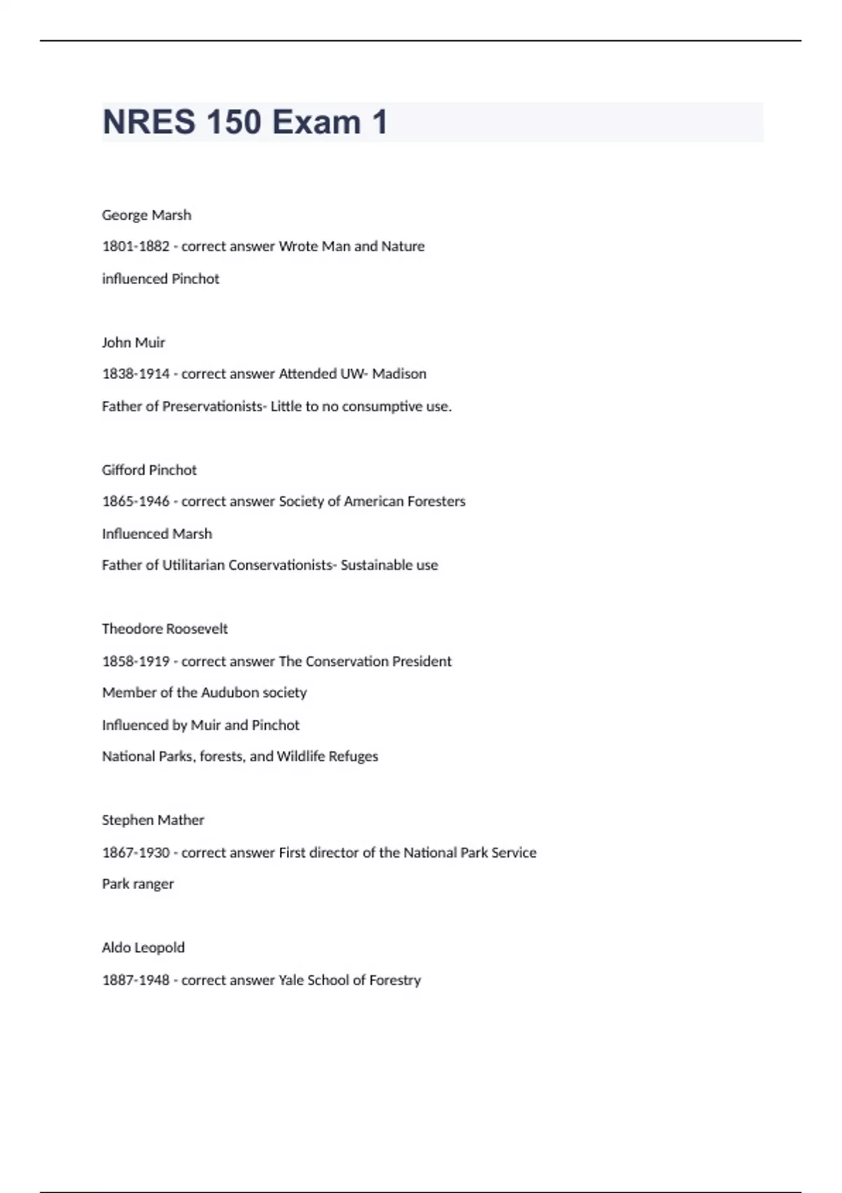 NRES 150 Exam 1 Written Exam 2024. George Marsh - correct answer Wrote Man and Nature influenced Pinchot John Muir - correct answer Attended UW- Madison Father of Preservationists- Little to no consumptive use. Gifford Pinchot - correct answer Society of American Foresters Influenced Marsh Father of Utilitarian Conservationists- Sustainable use Theodore Roosevelt - correct answer The Conservation President Member of the Audubon society Influenced by Muir and Pinchot National Parks, forests, and Wildlife Refuges Stephen Mather - correct answer First director of the National Park Service Park ranger Aldo Leopold - correct answer Yale School of Forestry