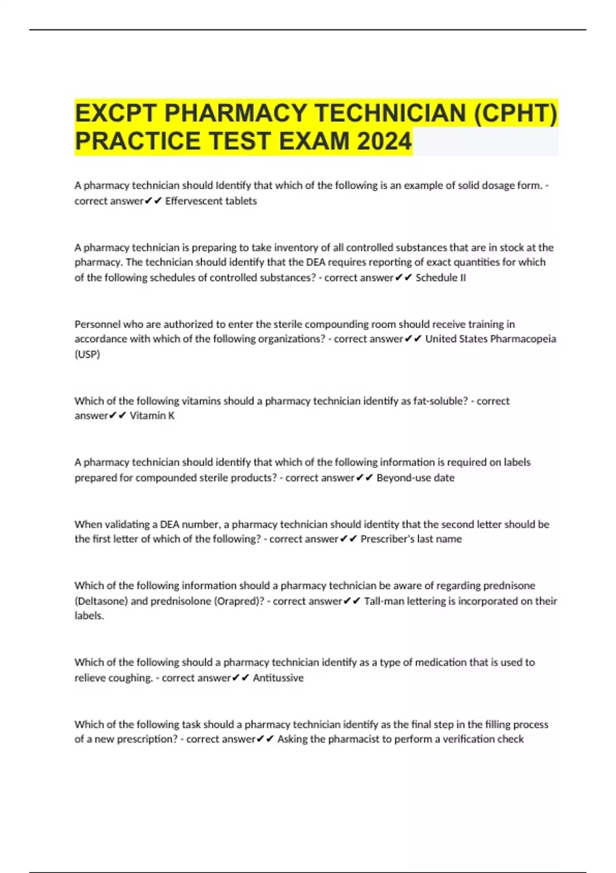 EXCPT PHARMACY TECHNICIAN (CPHT) PRACTICE TEST EXAM 2024 A pharmacy technician should Identify that which of the following is an example of solid dosage form. - correct answer Effervescent tablets A pharmacy technician is preparing to take inventory of all controlled substances that are in stock at the pharmacy. The technician should identify that the DEA requires reporting of exact quantities for which of the following schedules of controlled substances? - correct answer Schedule II Personnel who are authorized to enter the sterile compounding room should receive training in accordance with which of the following organizations? - correct answer United States Pharmacopeia (USP) Which of the following vitamins should a pharmacy technician identify as fat-soluble? - correct answer Vitamin K A pharmacy technician should identify that which of the following information is required on labels prepared for compounded sterile products? - correct answer Beyond-use date When validating a DEA number, a pharmacy technician should identity that the second letter should be the first letter of which of the following? - correct answer Prescriber's last name Which of the following information should a pharmacy technician be aware of regarding prednisone (Deltasone) and prednisolone (Orapred)? - correct answer Tall-man lettering is incorporated on their labels.
