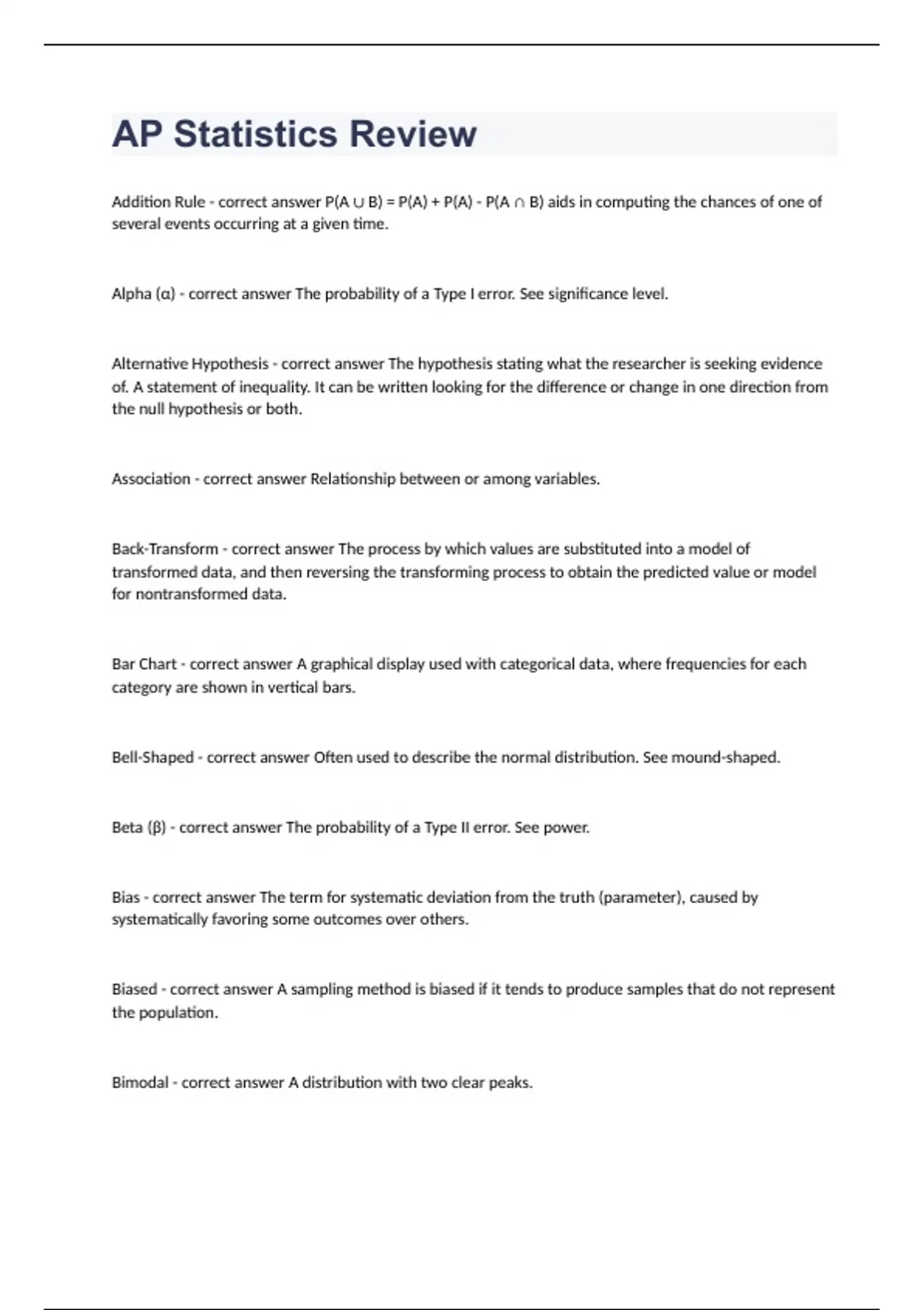 AP Statistics Review Practice Exam Questions 2024. Addition Rule - correct answer P(A ∪ B) = P(A) + P(A) - P(A ∩ B) aids in computing the chances of one of several events occurring at a given time. Alpha (α) - correct answer The probability of a Type I error. See significance level. Alternative Hypothesis - correct answer The hypothesis stating what the researcher is seeking evidence of. A statement of inequality. It can be written looking for the difference or change in one direction from the null hypothesis or both. Association - correct answer Relationship between or among variables. Back-Transform - correct answer The process by which values are substituted into a model of transformed data, and then reversing the transforming process to obtain the predicted value or model for nontransformed data. Bar Chart - correct answer A graphical display used with categorical data, where frequencies for each category are shown in vertical bars. Bell-Shaped - correct answer Often used to describe the normal distribution. See mound-shaped. Beta (β) - correct answer The probability of a Type II error. See power. Bias - correct answer The term for systematic deviation from the truth (parameter), caused by systematically favoring some outcomes over others. Biased - correct answer A sampling method is biased if it tends to produce samples that do not represent the population. Bimodal - correct answer A distribution with two clear peaks.