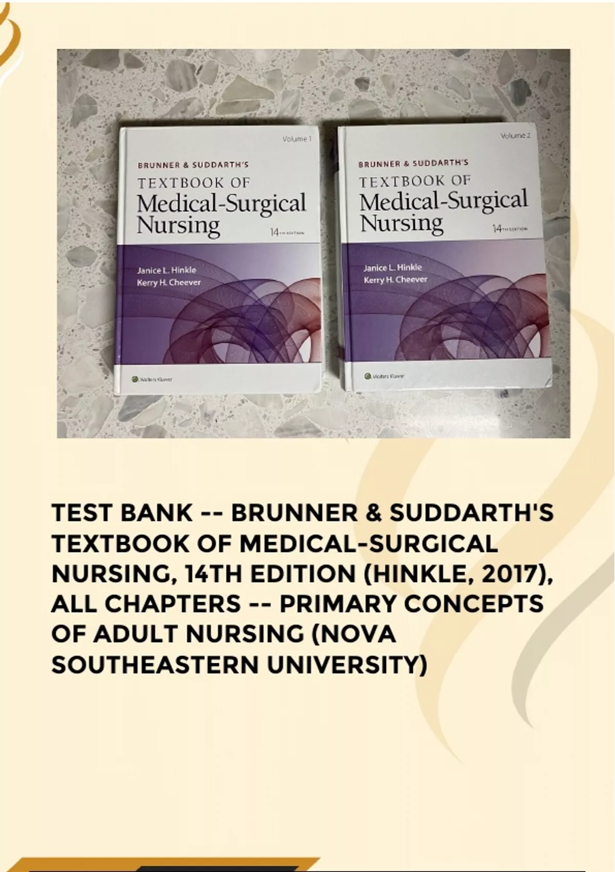 TEST BANK -- BRUNNER & SUDDARTH'S TEXTBOOK OF MEDICAL-SURGICAL NURSING, 14TH EDITION (HINKLE, 2017), ALL CHAPTERS -- PRIMARY CONCEPTS OF ADULT NURSING (NOVA SOUTHEASTERN UNIVERSITY)