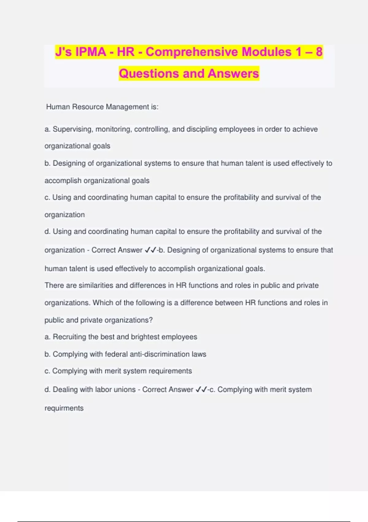 J's IPMA - HR - Comprehensive Modules 1 – 8 Questions and Answers