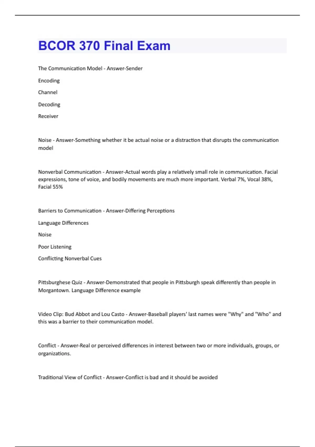 The Communication Model - Answer-Sender Encoding Channel Decoding Receiver Noise - Answer-Something whether it be actual noise or a distraction that disrupts the communication model Nonverbal Communication - Answer-Actual words play a relatively small role in communication. Facial expressions, tone of voice, and bodily movements are much more important. Verbal 7%, Vocal 38%, Facial 55% Barriers to Communication - Answer-Differing Perceptions Language Differences Noise Poor Listening Conflicting Nonverbal Cues Pittsburghese Quiz - Answer-Demonstrated that people in Pittsburgh speak differently than people in Morgantown. Language Difference example Video Clip: Bud Abbot and Lou Casto - Answer-Baseball players' last names were "Why" and "Who" and this was a barrier to their communication model. Conflict - Answer-Real or perceived differences in interest between two or more individuals, groups, or organizations. Traditional View of Conflict - Answer-Conflict is bad and it should be avoidedHuman Relations View of Conflict - Answer-Conflict is inevitable and should be accepted Interactionist View of Conflict - Answer-Some conflict can be helpful and should be encouraged Task Conflict - Answer-A type of conflict that can be beneficial Relationship Conflict - Answer-Always bad and will nullify the possible positive effects of task conflict Styles of Conflict Handling - Answer-Avoidance Accommodating- Giving in to the other person Competing/Forcing Compromising Collaborating/Integrating Negotiation should... - Answer-Produce a wise agreement, if agreement is possible. Be efficient. Not damage the relationships of the parties involved. How do we usually negotiate? - Answer-Positional Bargaining -"Win, Lose" Bargaining Distributive Bargaining -Zero Sum Game (My gain is your loss) Positional Bargaining - Answer-Produces unwise agreements. -Ego becomes identified with the position. -Compromise solution often fails to meet the needs of those involved. Inefficient. -The more extreme the positions and smaller the concession the more time is wasted.Damages relationships. -Becomes a contest of wills that can damage or destroy a relationship. Principled Negotiating/"Win, Win" Negotiating/Integrative Bargaining - Answer-Separate the people from the problem -Attack the problem, not the people -Unite and face problem together Focus on interests, not positions -Objective is to satisfy underlying interests, positions only hinder. -Identify interests and work towards a solution that satisfies all Generate a variety of possibilities. -Don't search for one "right" solution Insist on some fair standard. Examples of Negotiation discussed during lecture - Answer-Positional- Dr. Houghton wanted his girlfriend to meet him at the concert while she wanted them to arrive together, which would cause Dr. Houghton to be late. Principled- Girlfriend was worried about safety, Dr. Houghton was worried about being late. Solved problem by Dr. Houghton paying for a valet for her. Stages of Team Development - Answer-Forming- uncertainty Storming- conflict Norming- cohesiveness Performing- functionality Types of Work Teams - Answer-Problem-solving Functional Self-managed Cross-functionalCharacteristics of Effective Teams - Answer-Clear Unity of Purpose Self-Conscious Clear and Demanding Goals Informal, Comfortable, and Relaxed Extensive Participation in Discussions Freedom to Express Ideas Disagreement is Viewed as Good General Agreement on Decisions Everyone Carried their Weight Frequent Constructive Criticism Shared Leadership